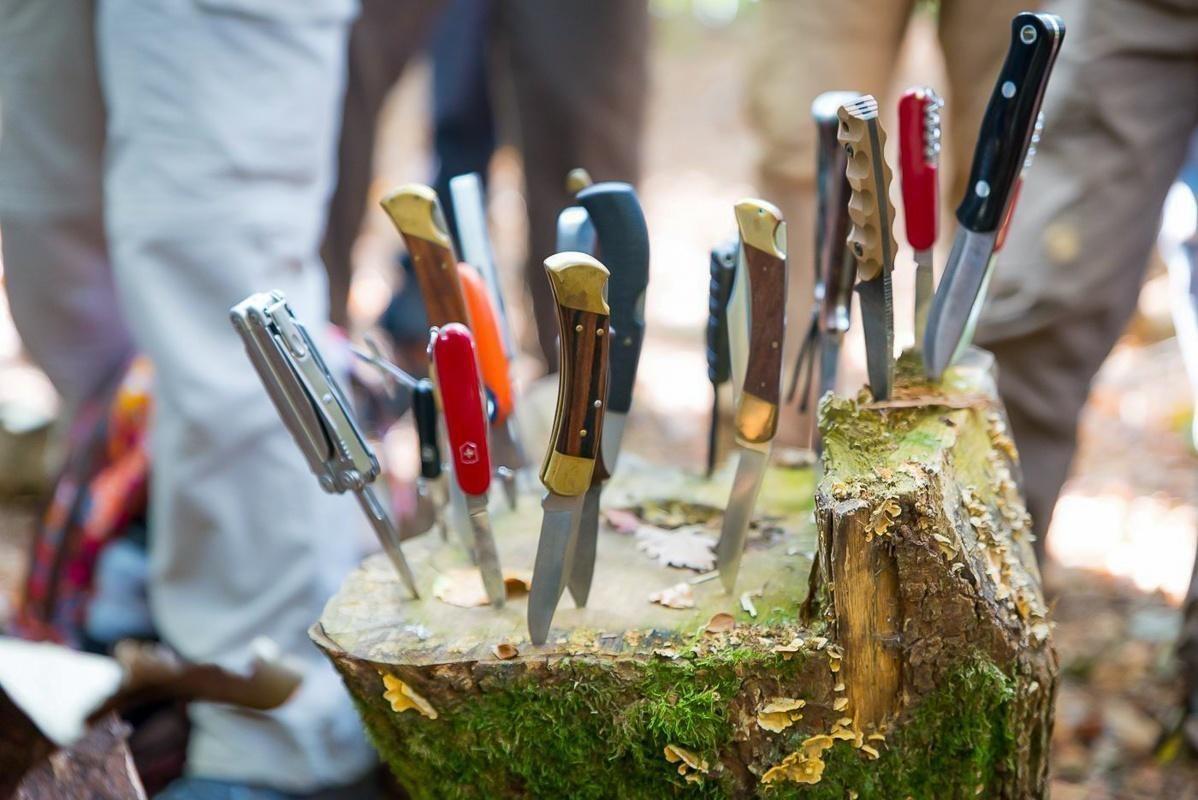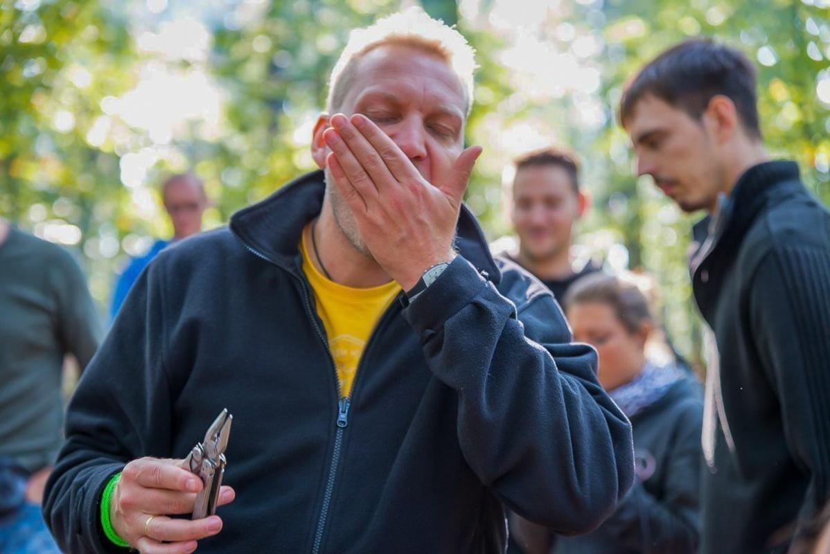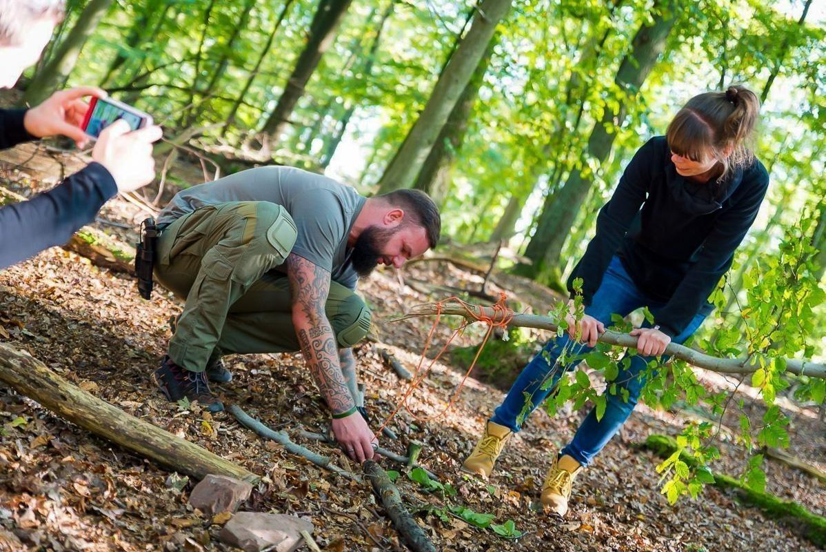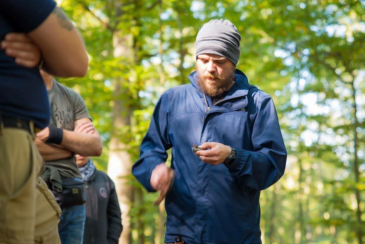Mann zeigt anderen Teilnehmern eine Technik mit einem Werkzeug im Wald