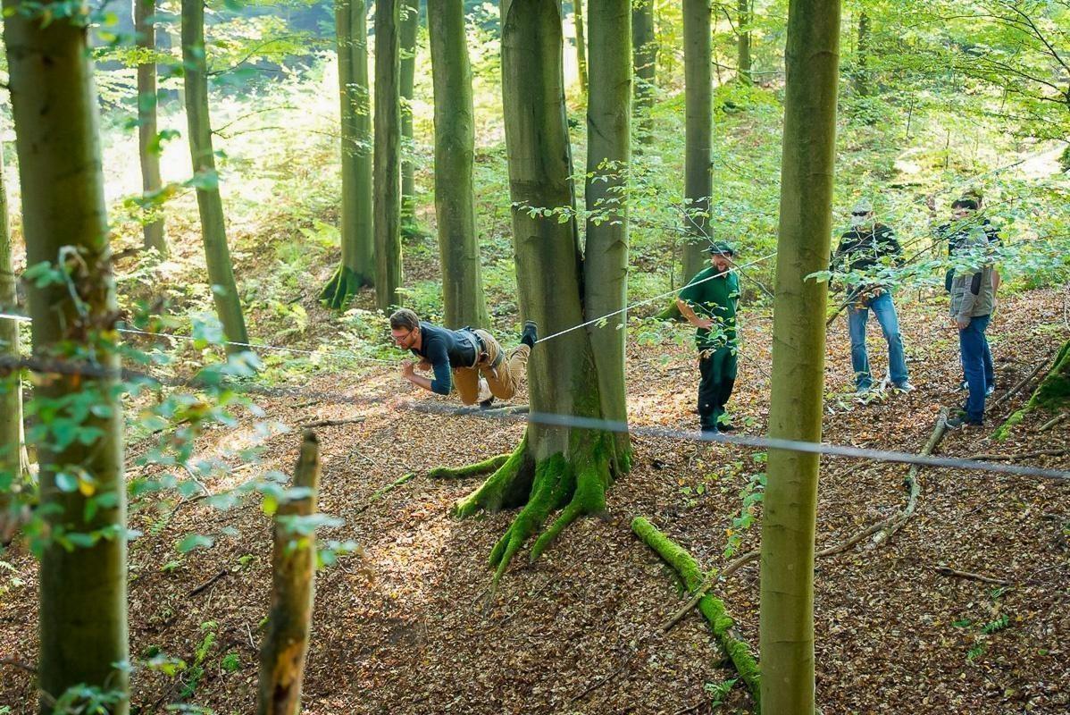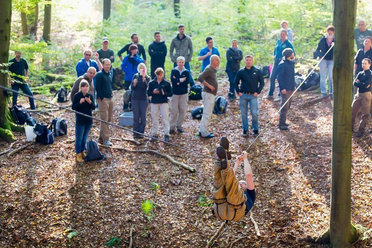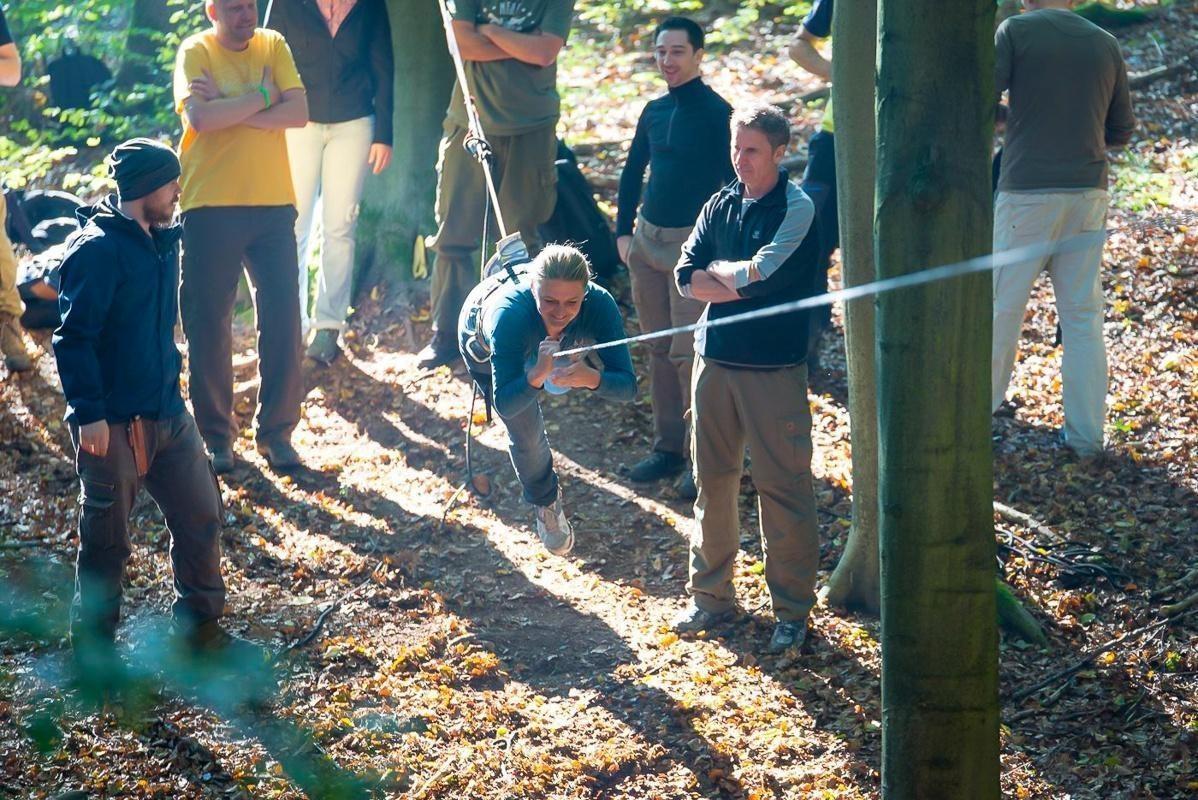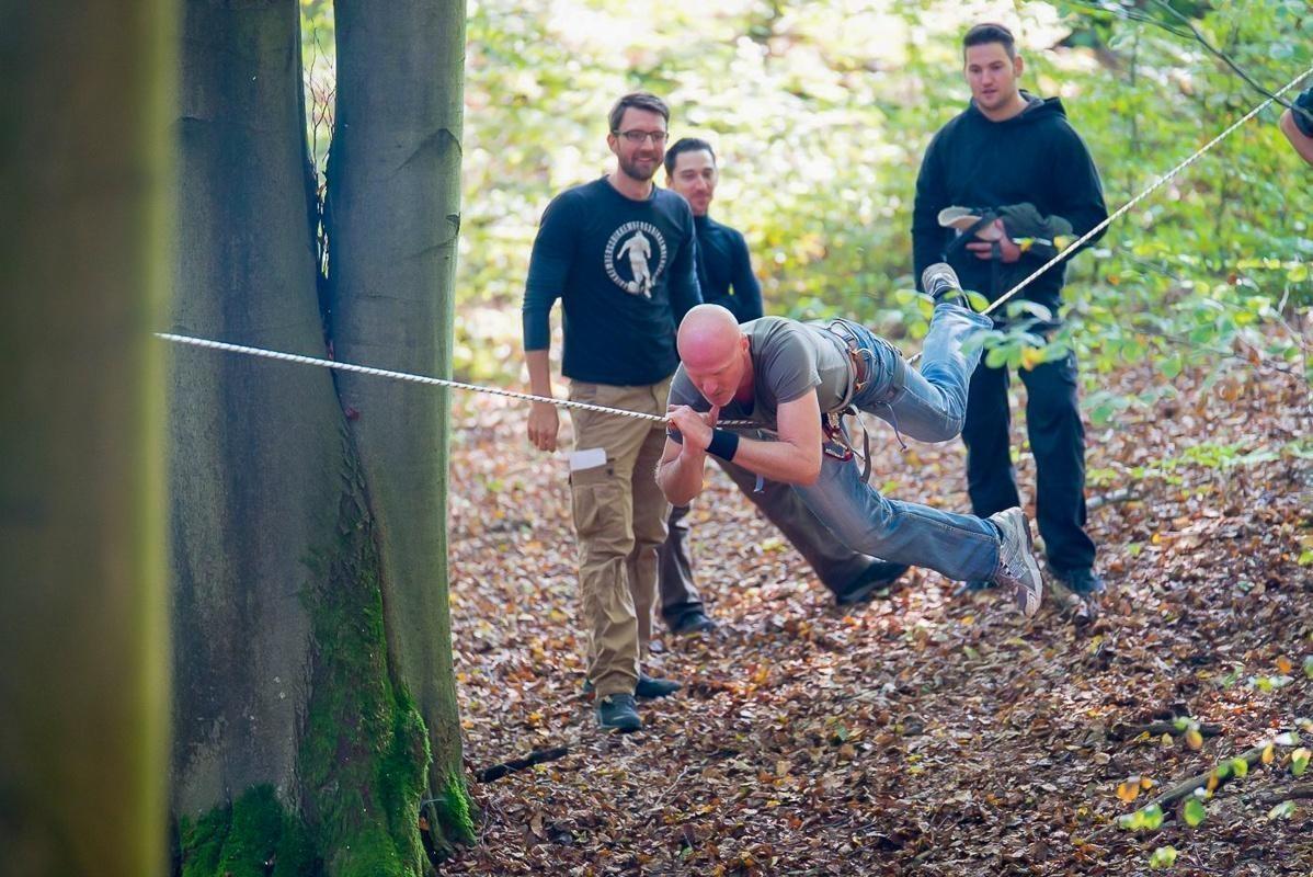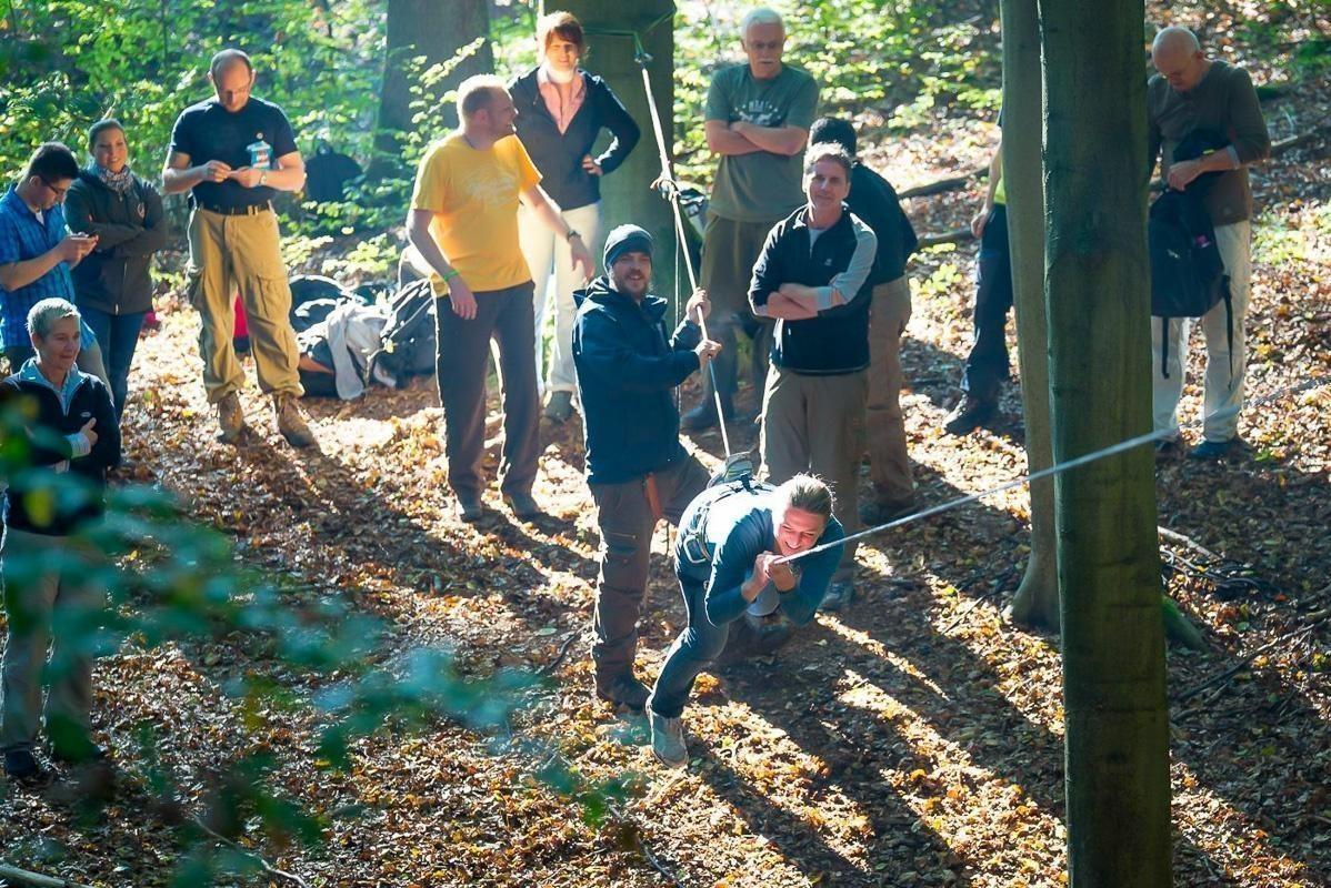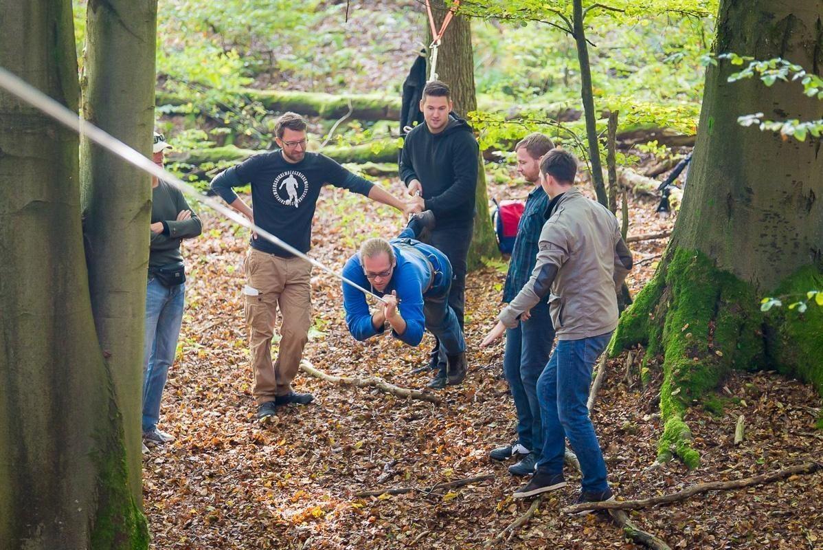 Seilfalle ist zwischen zwei Bäumen gespannt, Teilnehmer beobachten die Konstruktion