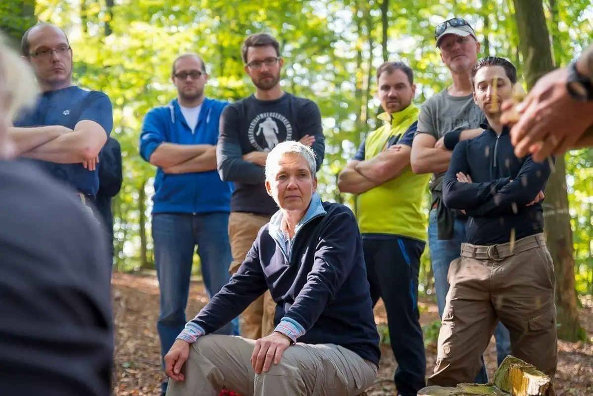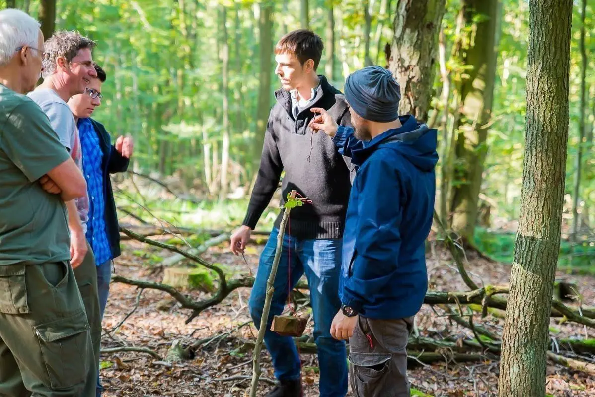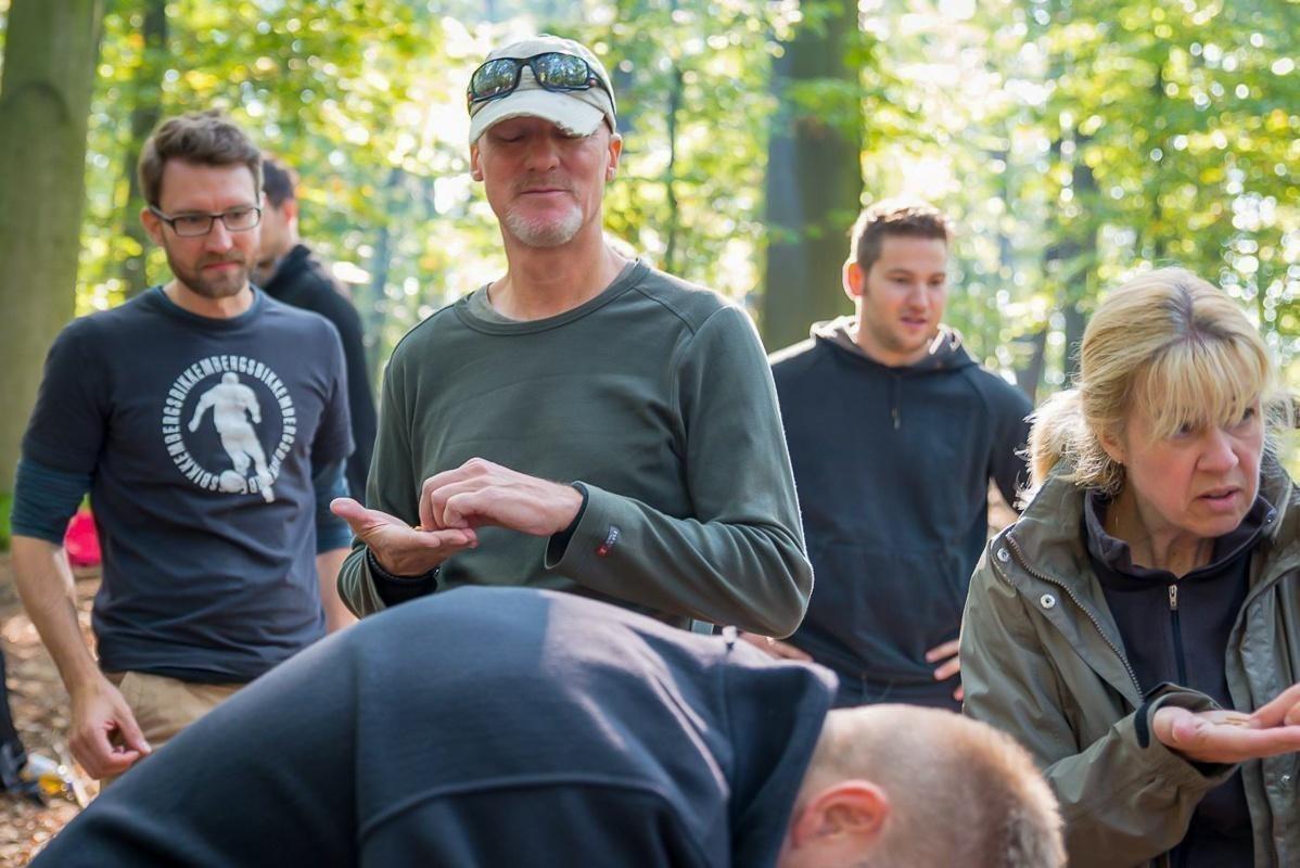 Mann erklärt eine Technik im Wald, während andere Teilnehmer zuhören