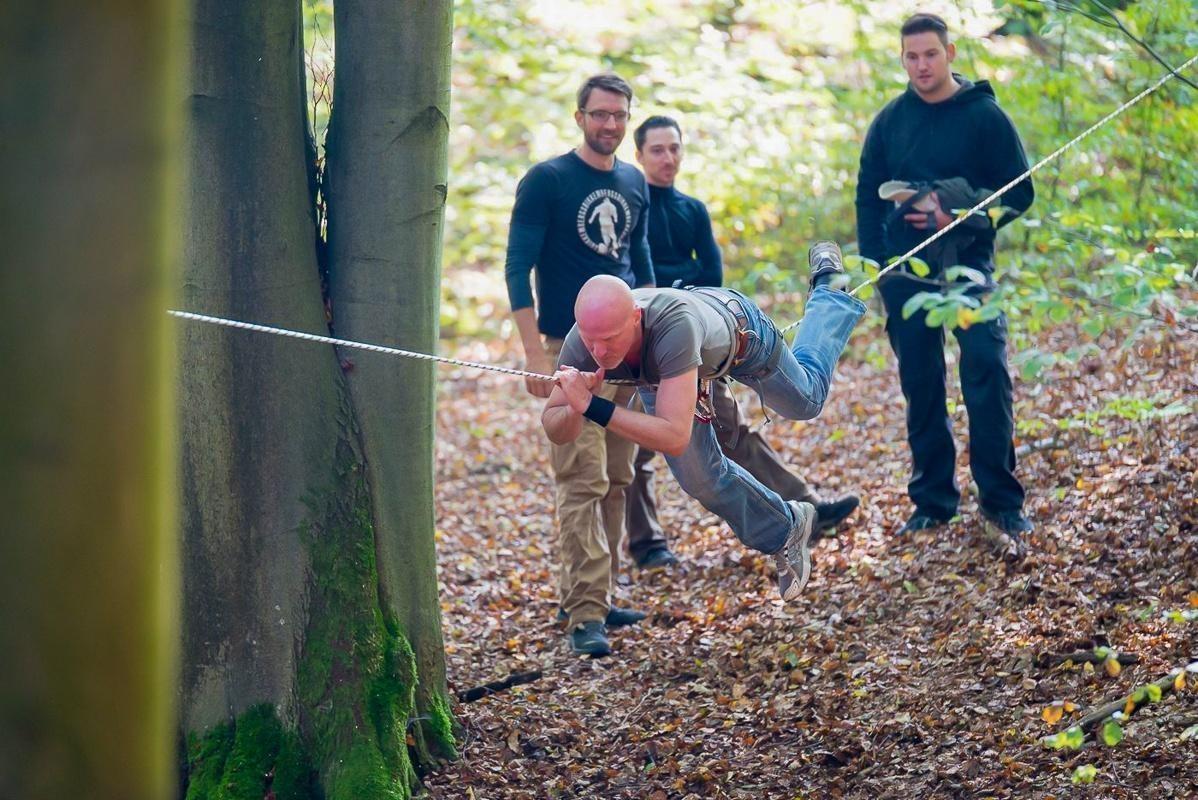 Teilnehmer nutzt eine Seilbrücke zur Überquerung eines Hindernisses im Wald