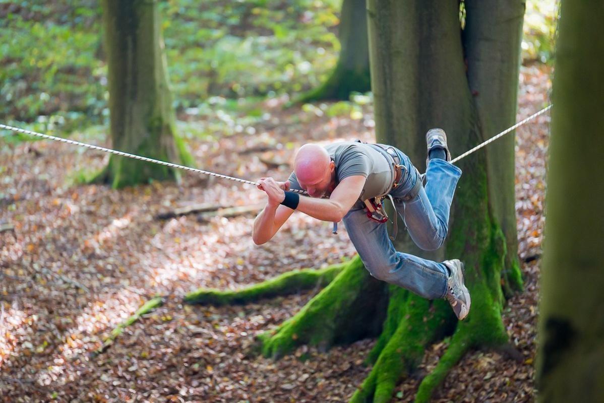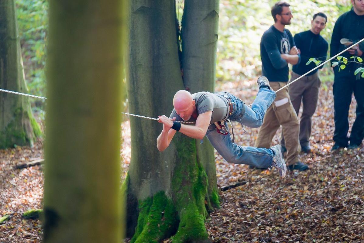 Ein Teilnehmer nutzt eine Seilbrücke zwischen zwei Bäumen zur Fortbewegung