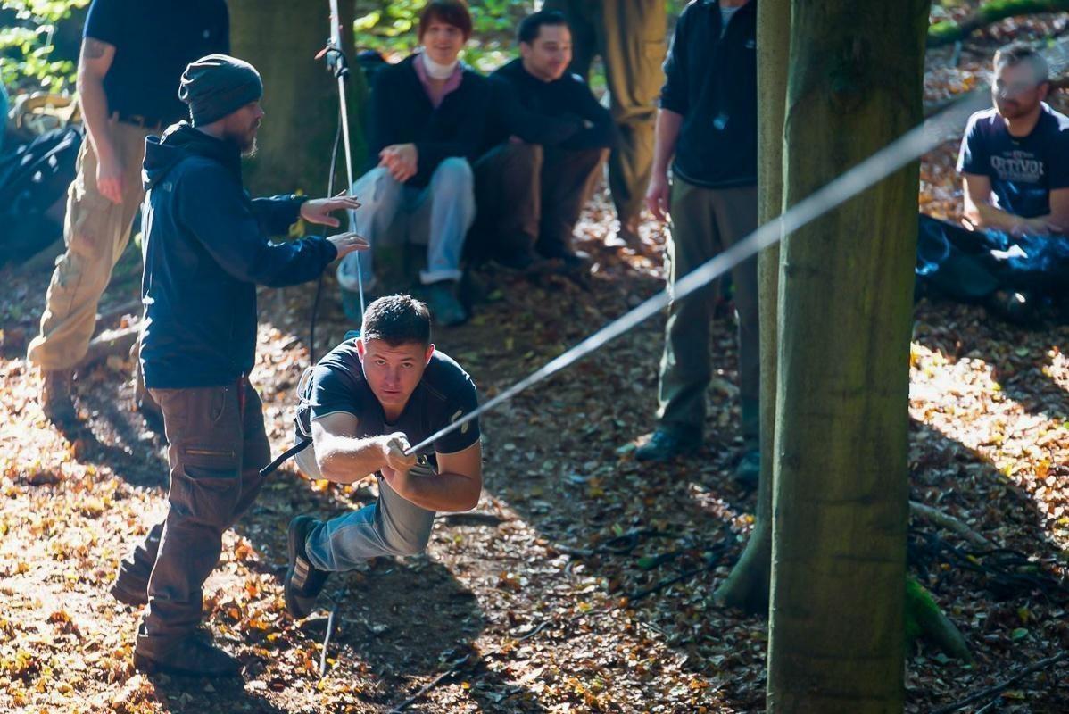 Ein Teilnehmer nutzt eine Seilbrücke, während ein Trainer Anweisungen gibt