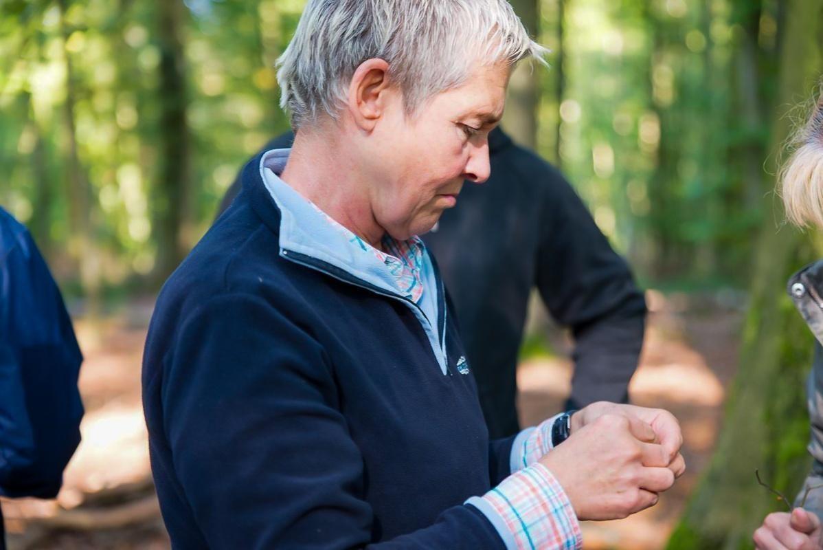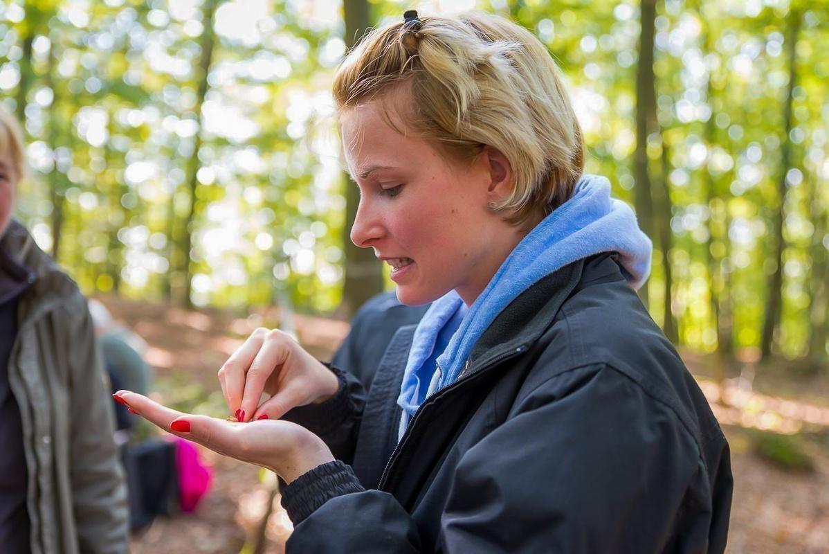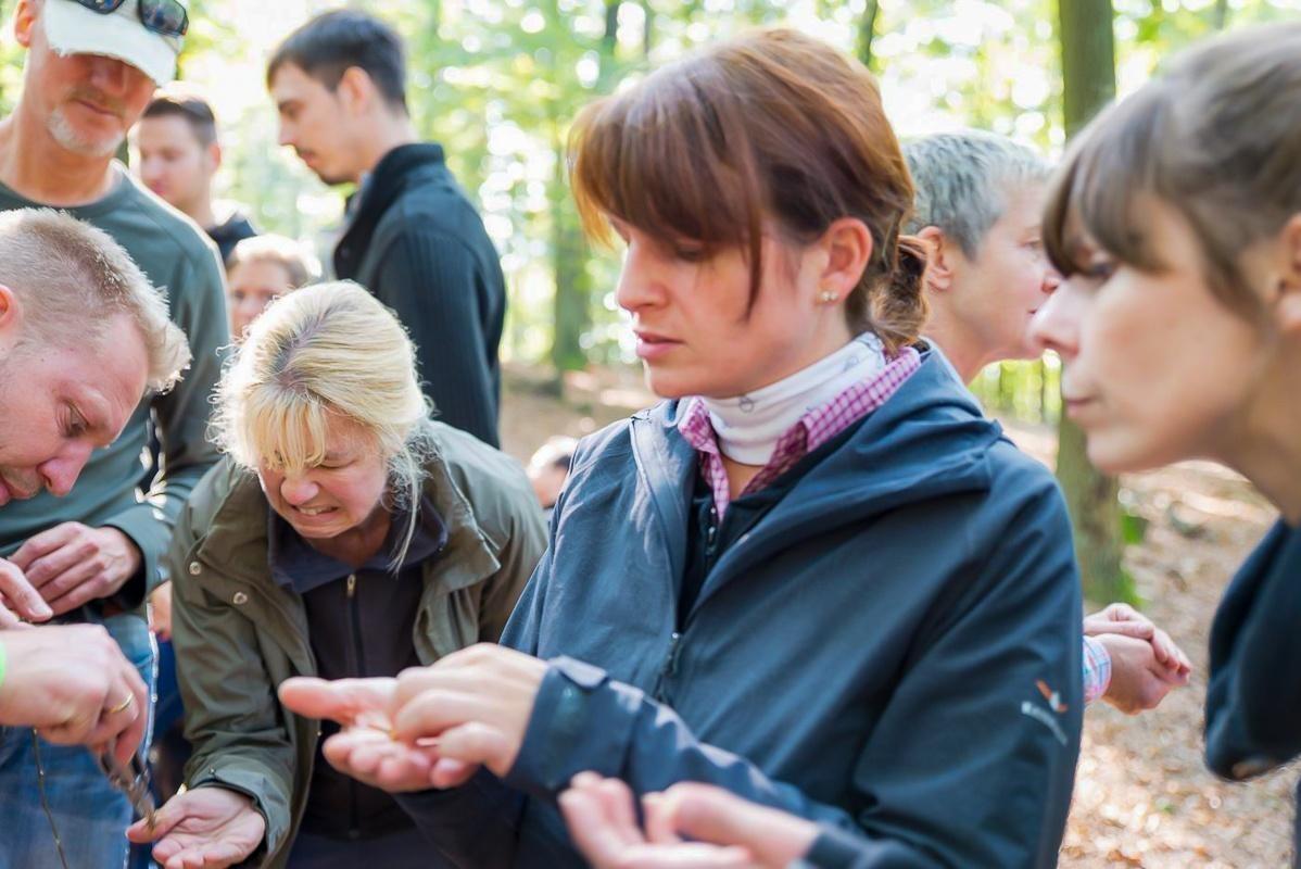 Teilnehmende betrachten etwas in ihren Händen im Wald