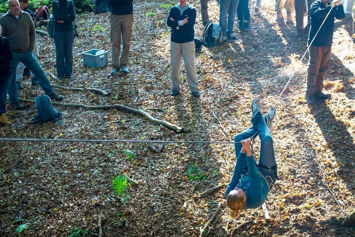 Teilnehmer üben das Abseilen an einer selbstgebauten Seilbrücke zwischen Bäumen