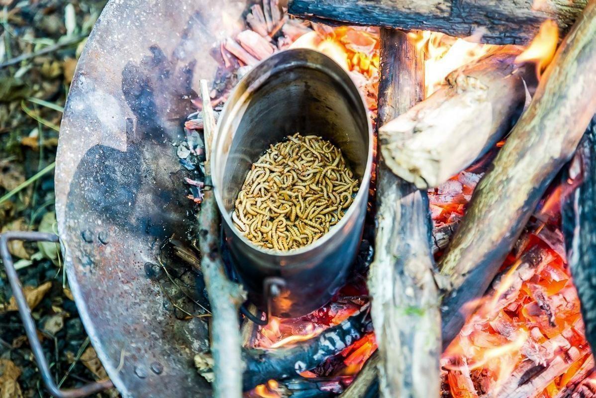 Eisenkessel mit Insekten über offenem Feuer zum Garen platziert