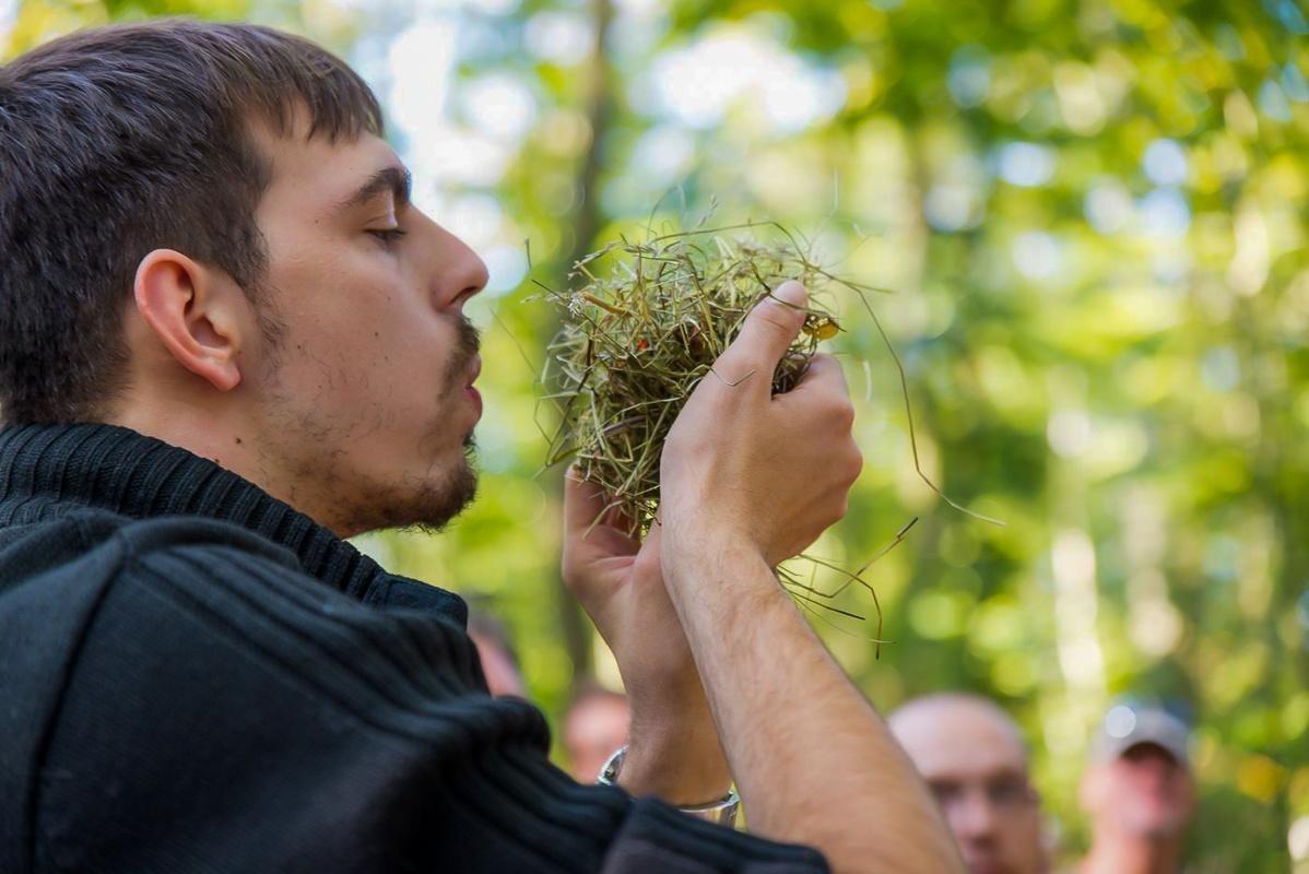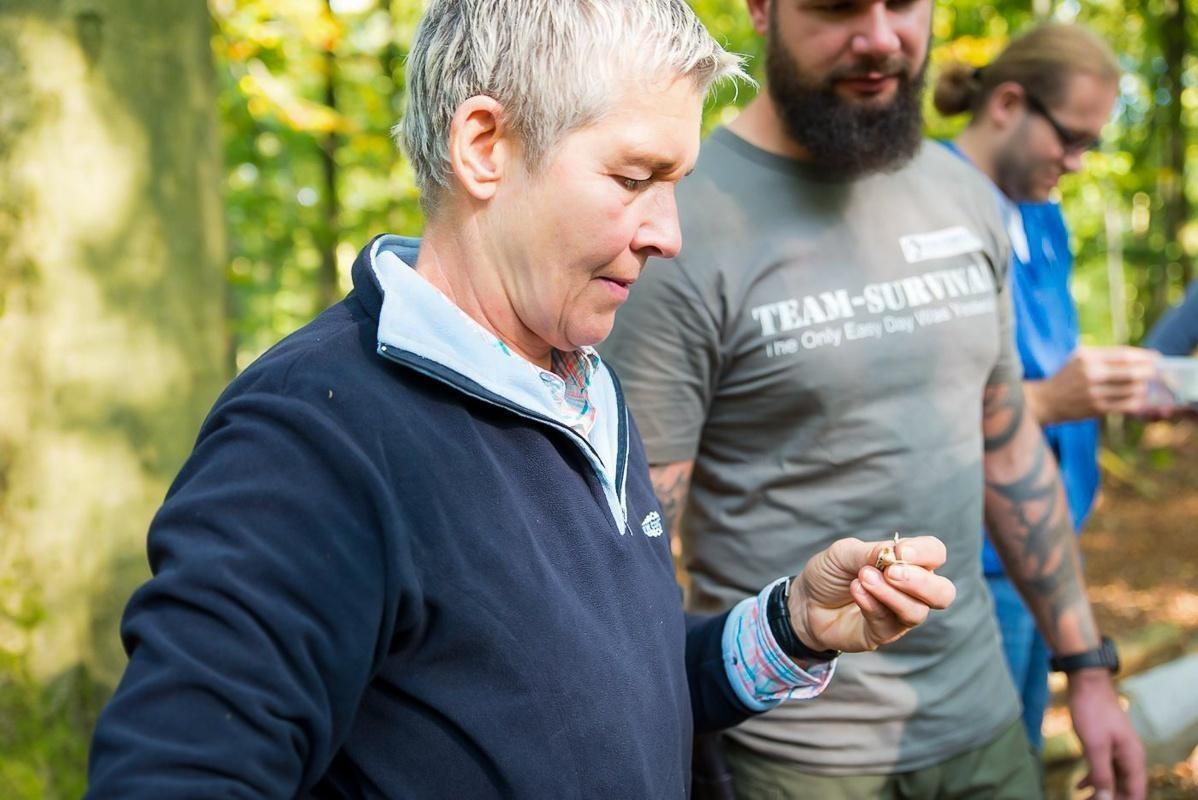 Teilnehmer betrachten aufmerksam kleine Objekte in den Händen im Wald