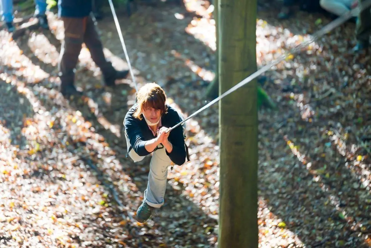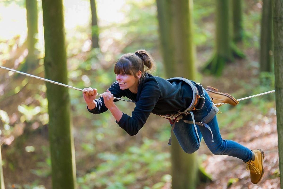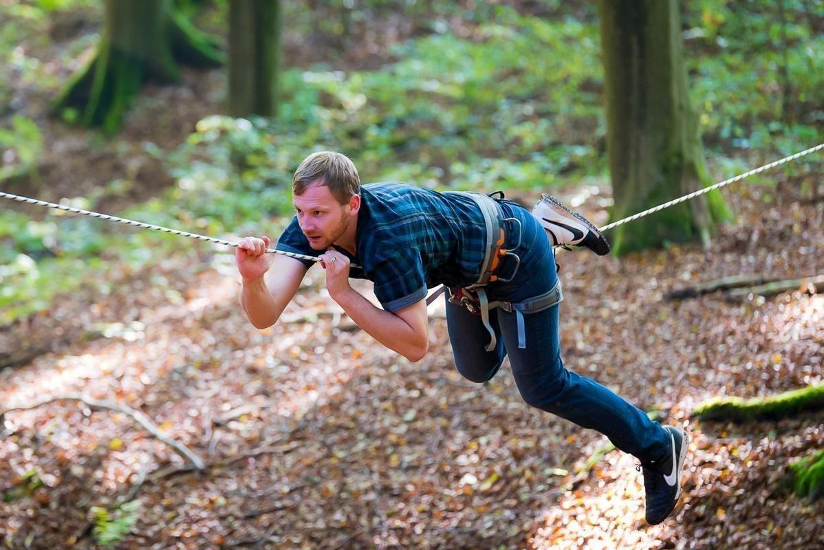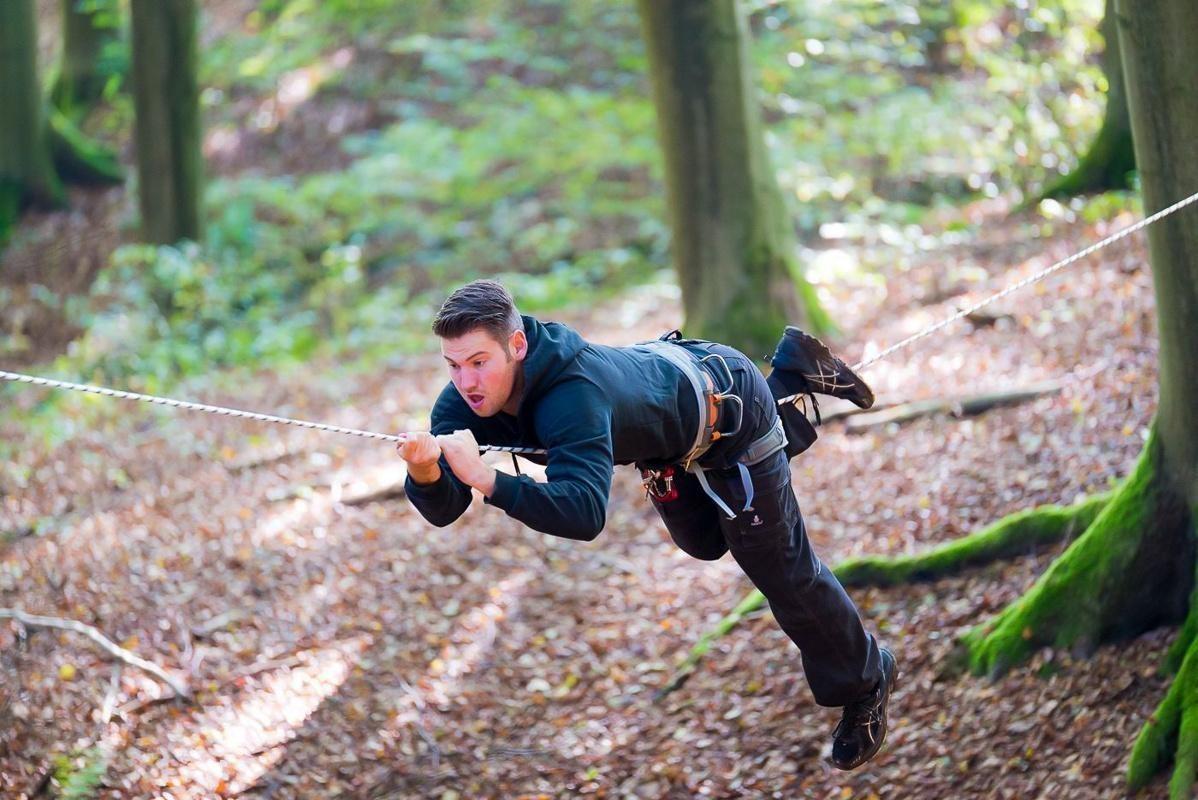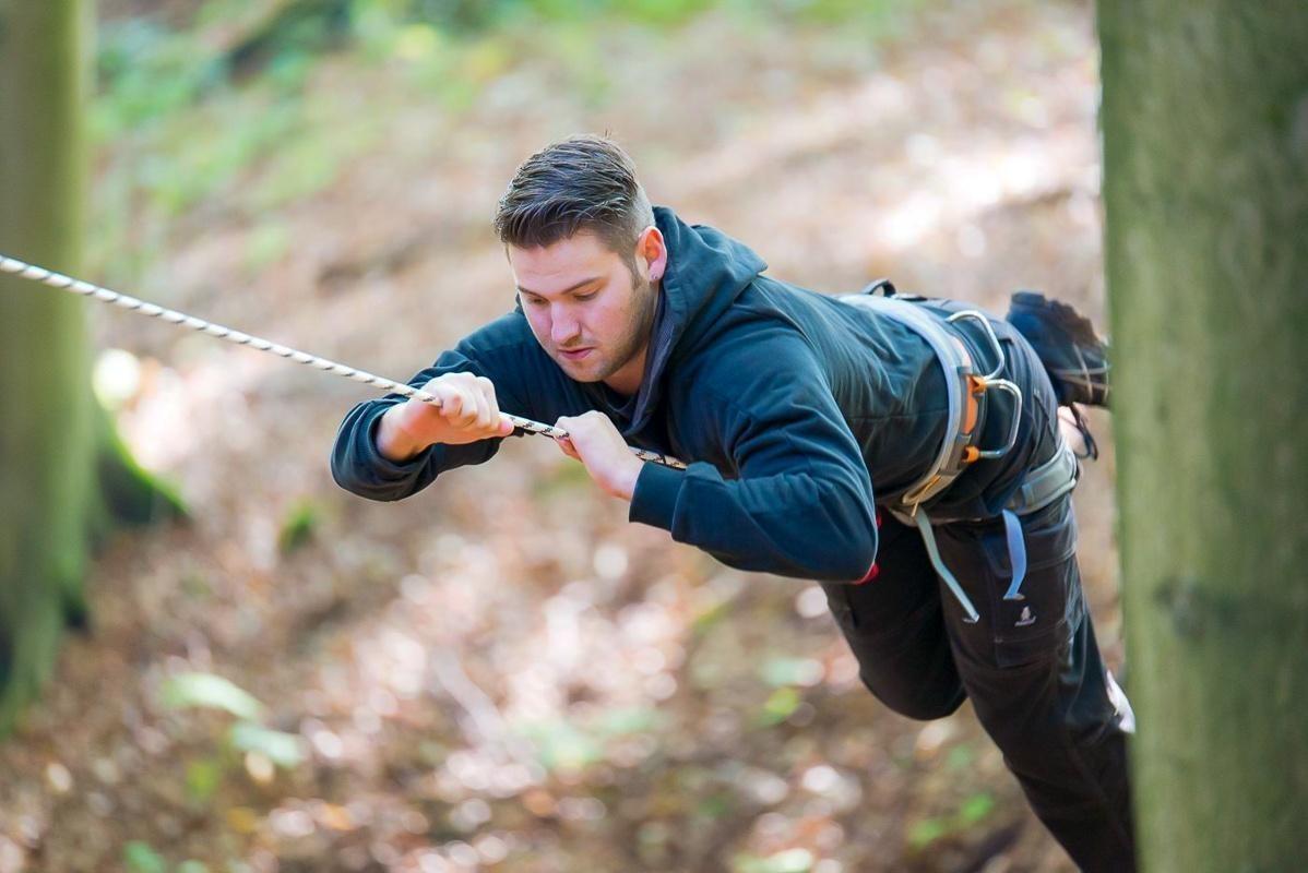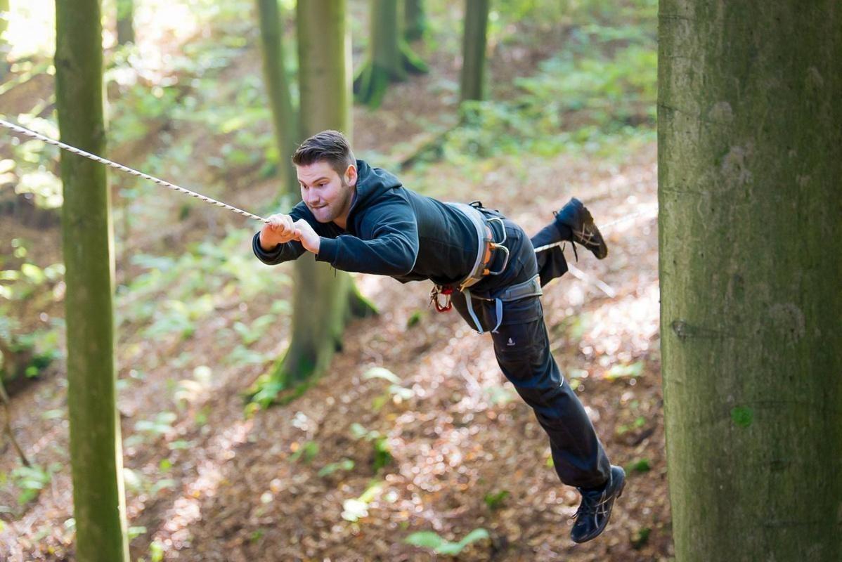 Teilnehmer nutzt Seilbrücke zur Überquerung eines Waldgebiets
