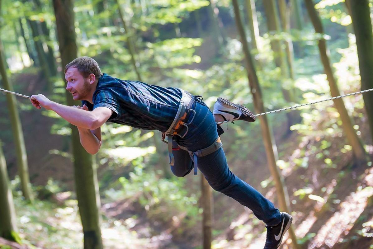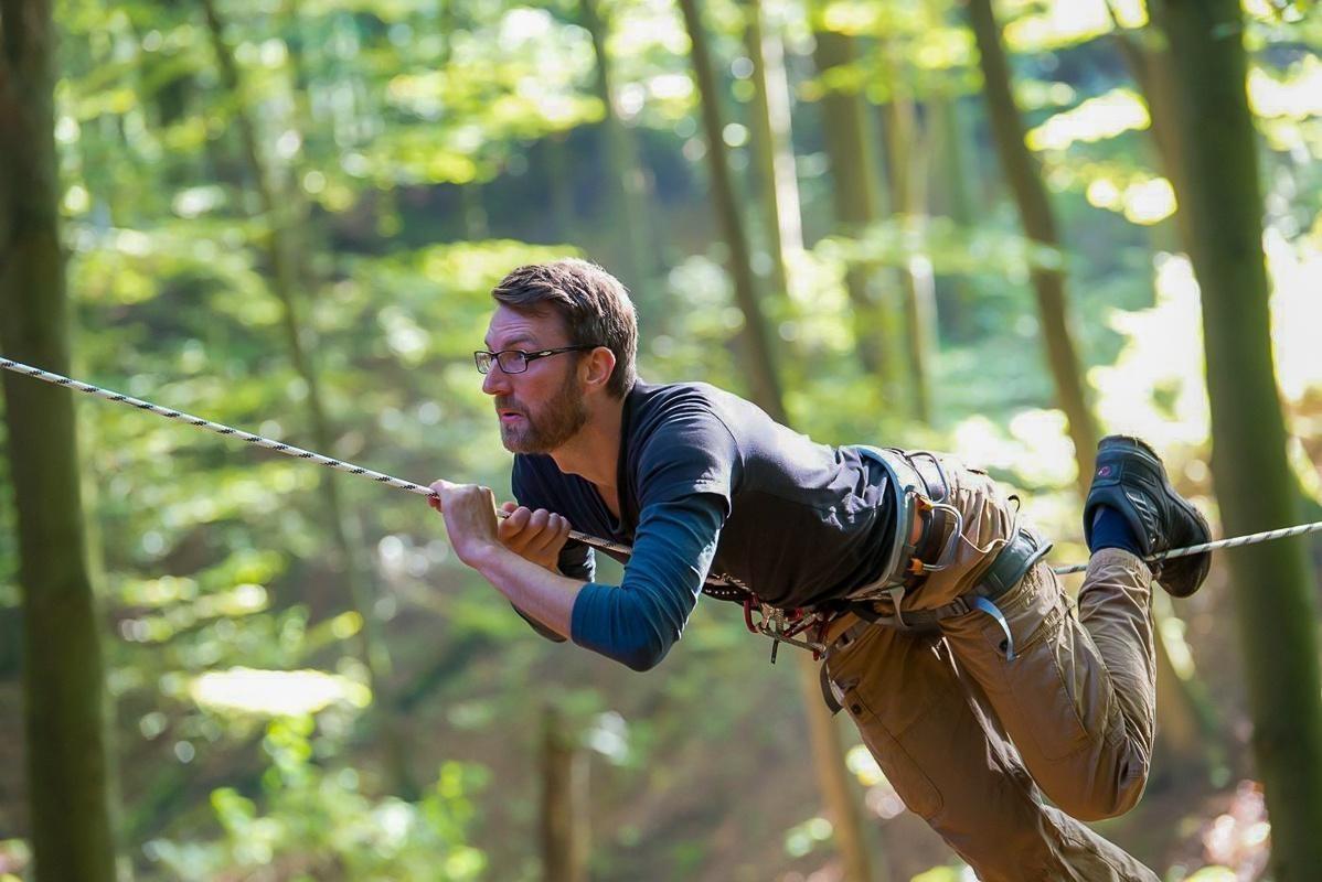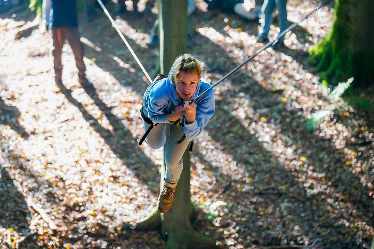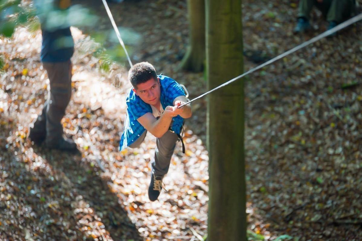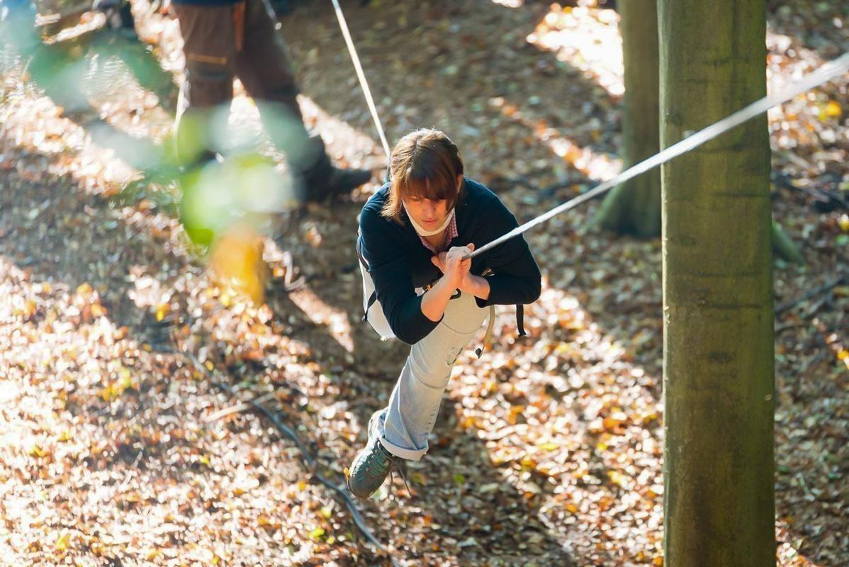 Teilnehmer nutzt Seilbrücke zur Überquerung eines Waldgebiets