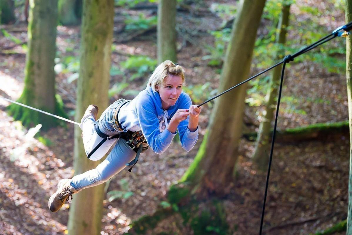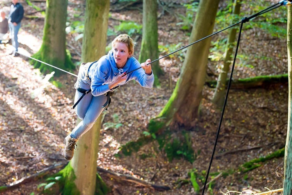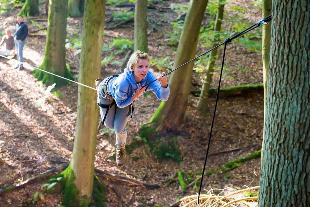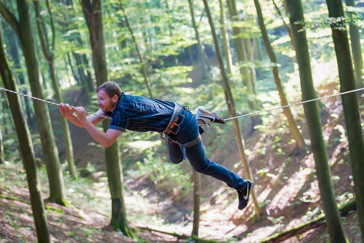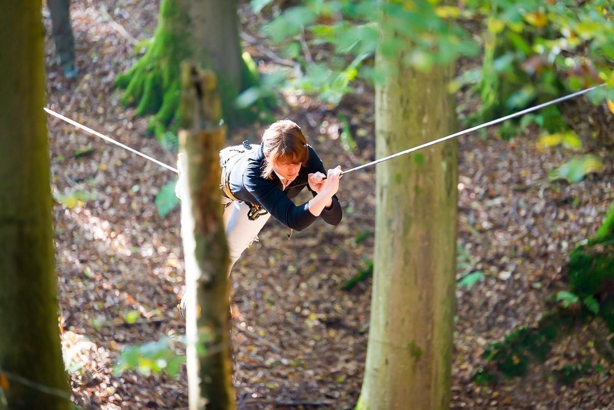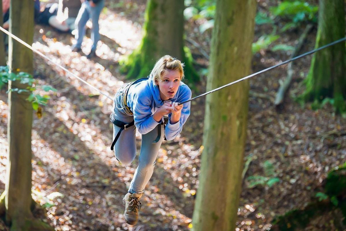 Teilnehmer nutzt Seilbrücke zur Überquerung eines Waldgebiets