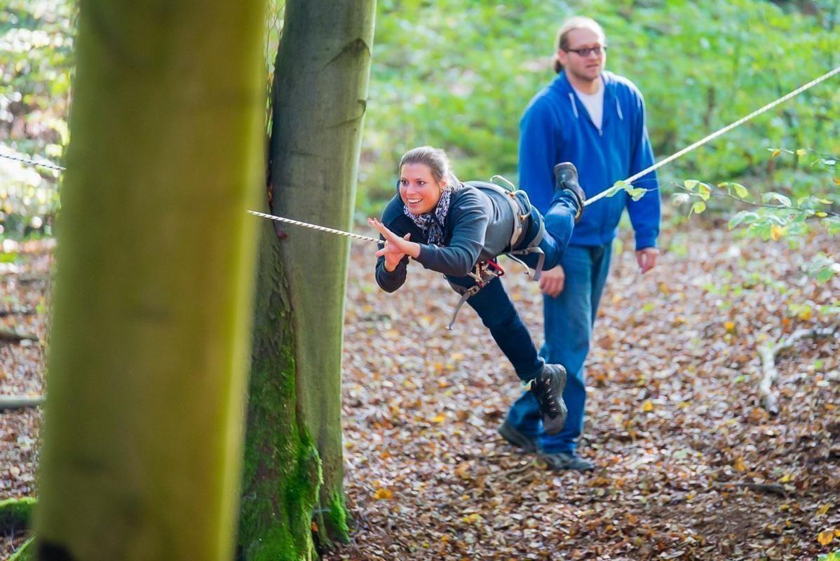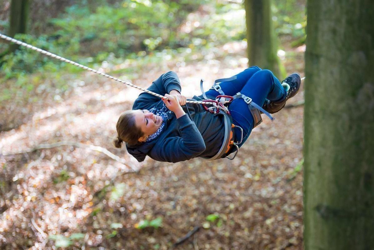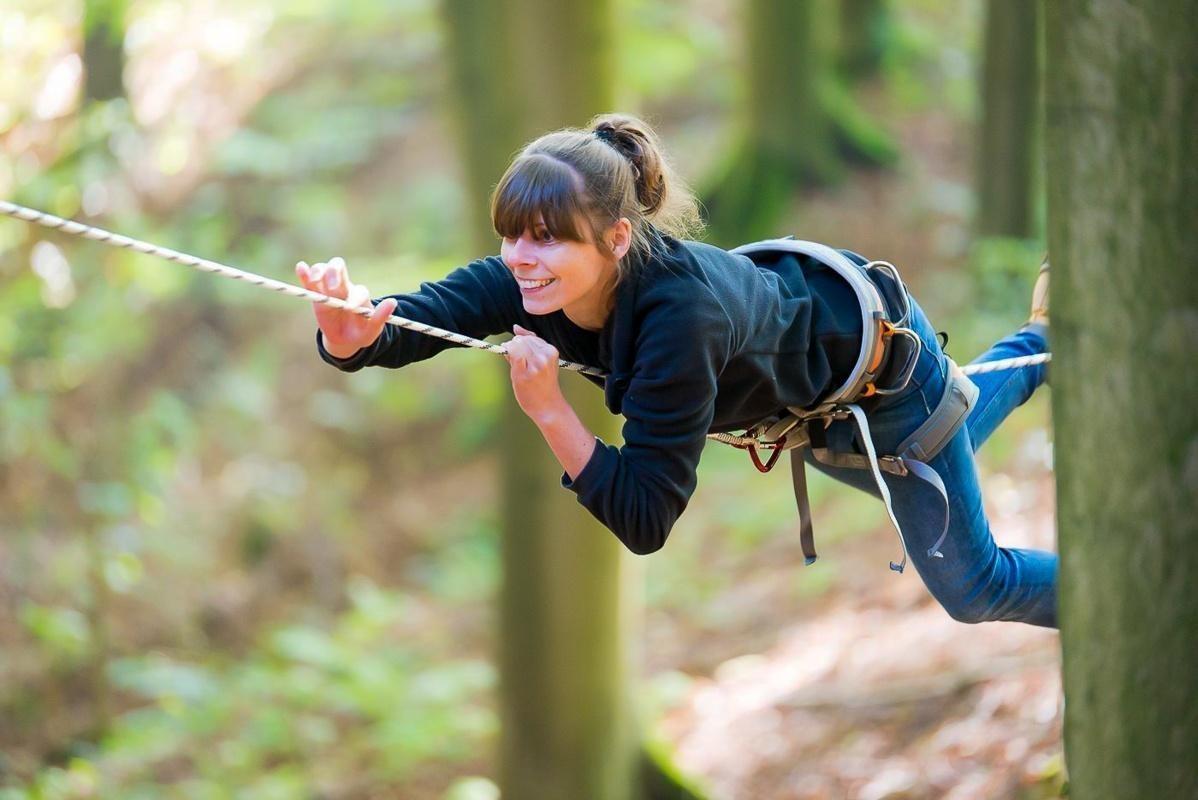 Seilbrücke wird zwischen zwei Bäumen genutzt, um hindurch zu schwingen