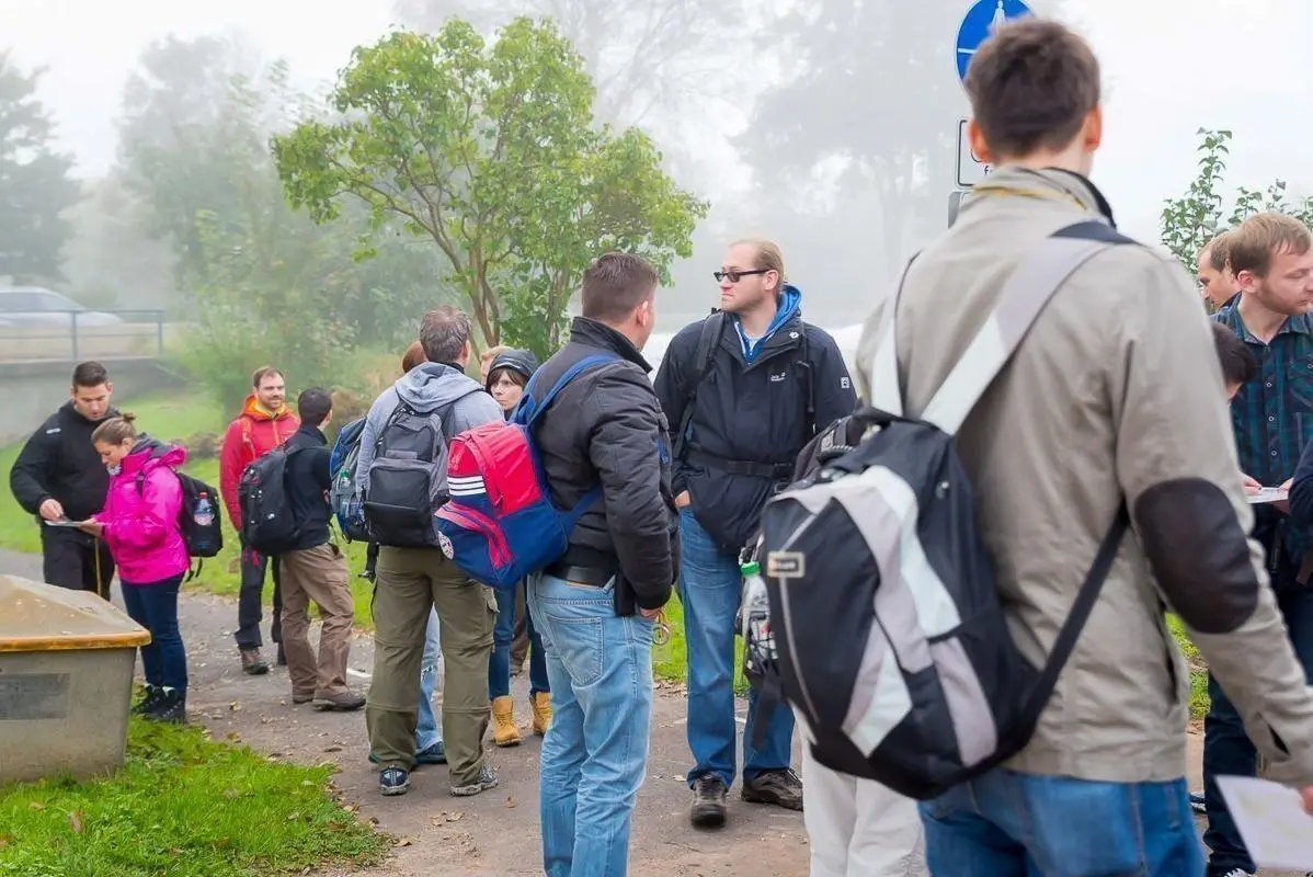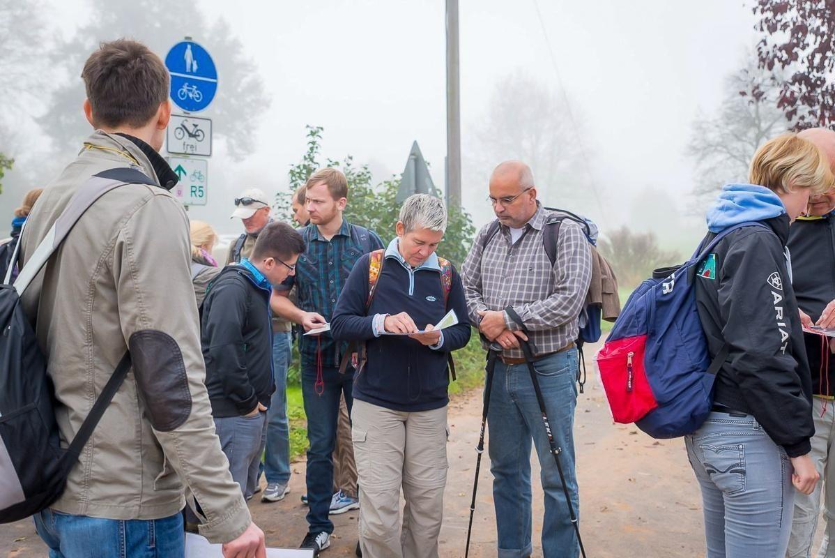 Gruppe von Personen diskutiert auf einem Weg, einige halten Karten oder Notizen