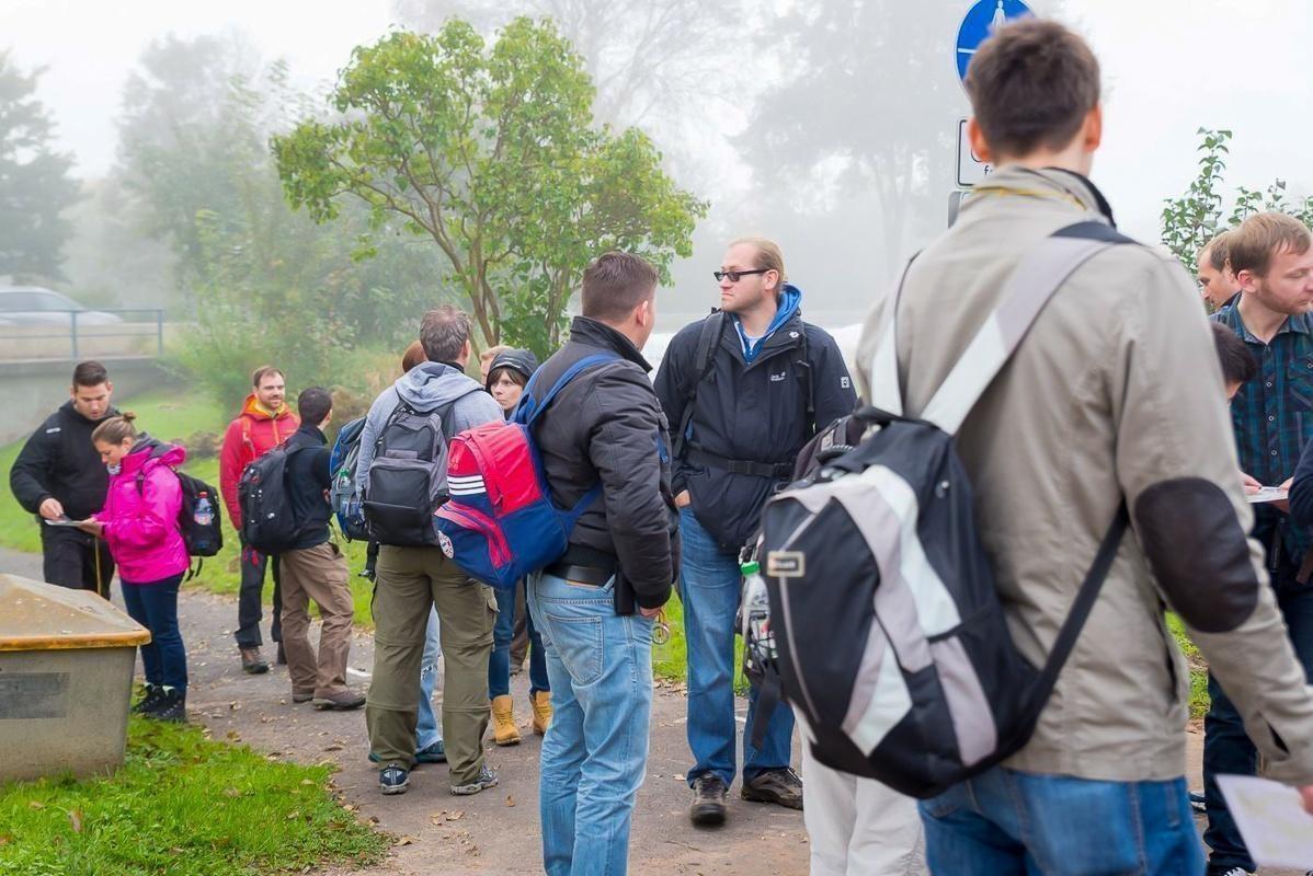Gruppe von Personen mit Rucksäcken steht auf einer Wiese in nebliger Umgebung
