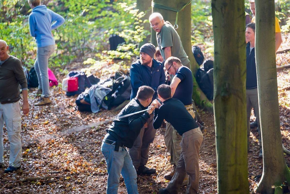 Gruppenteilnehmer üben eine Technik in einem Waldgebiet mit Rucksäcken im Hintergrund