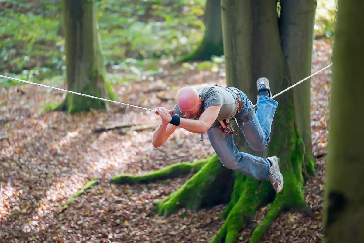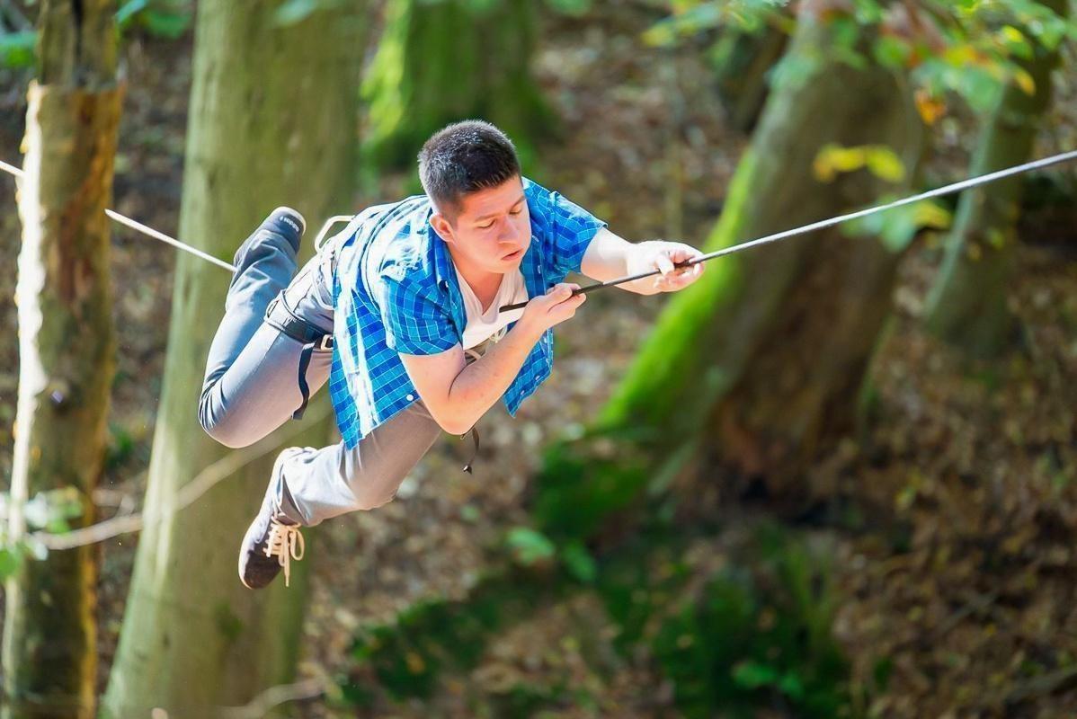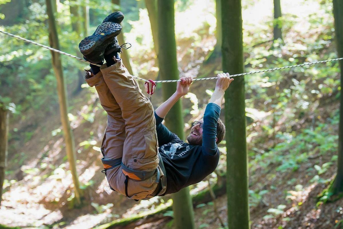 Ein Teilnehmer zieht sich an einem Seil zwischen Bäumen entlang