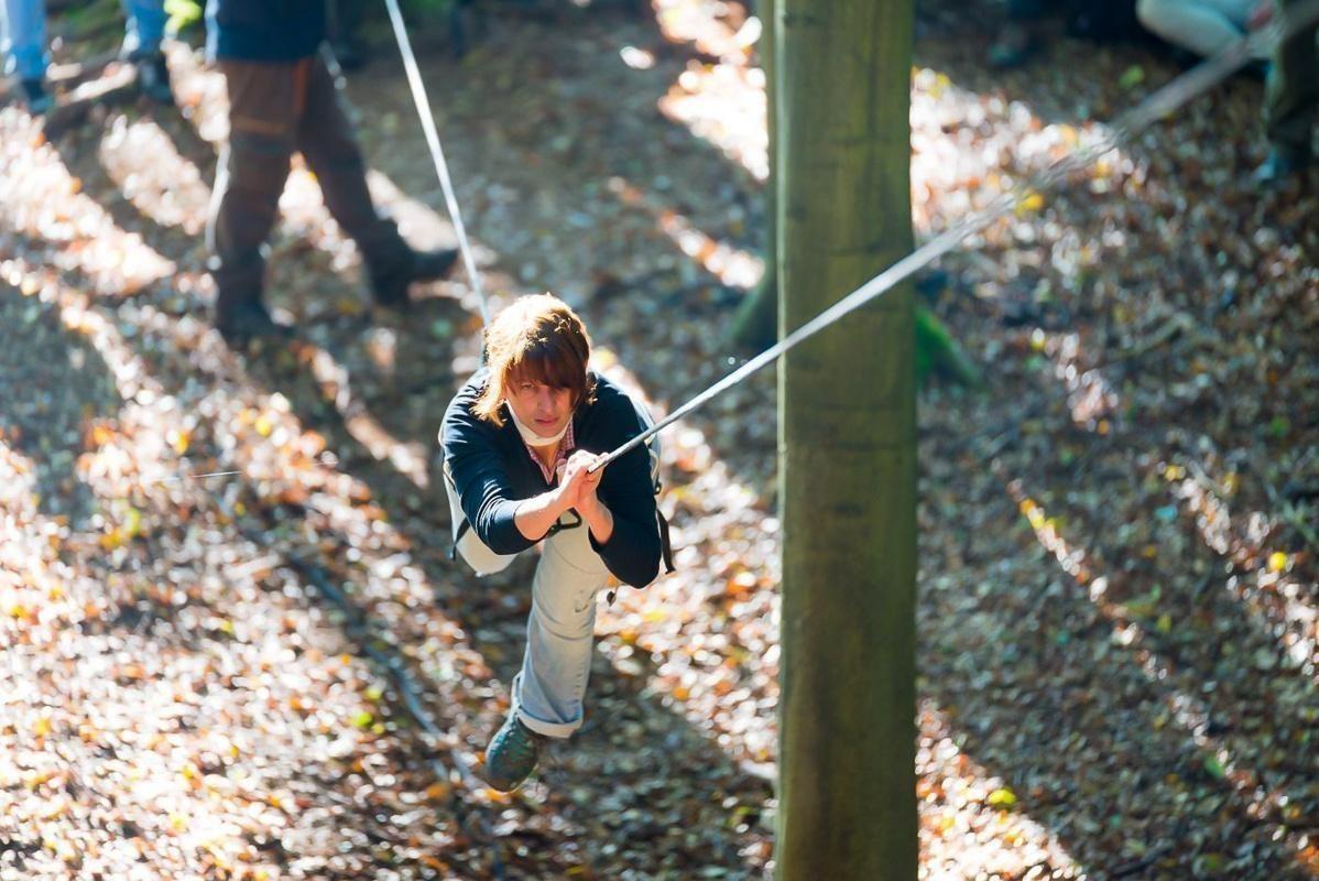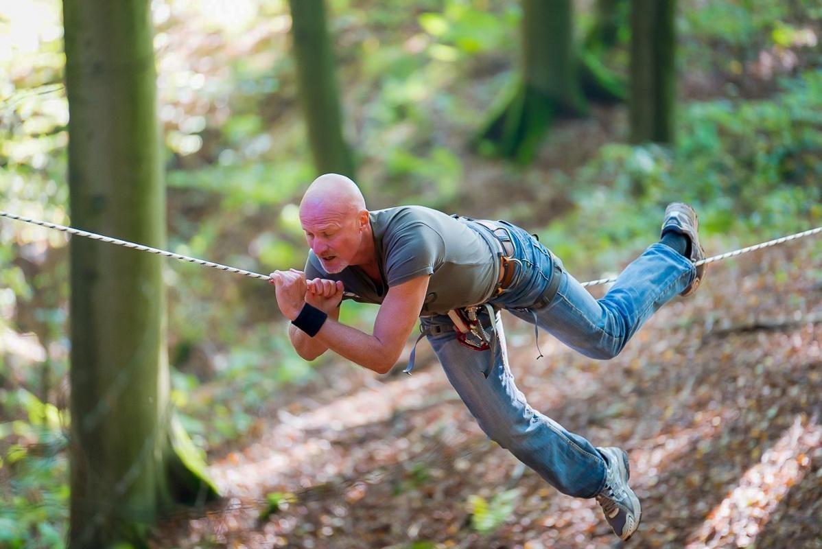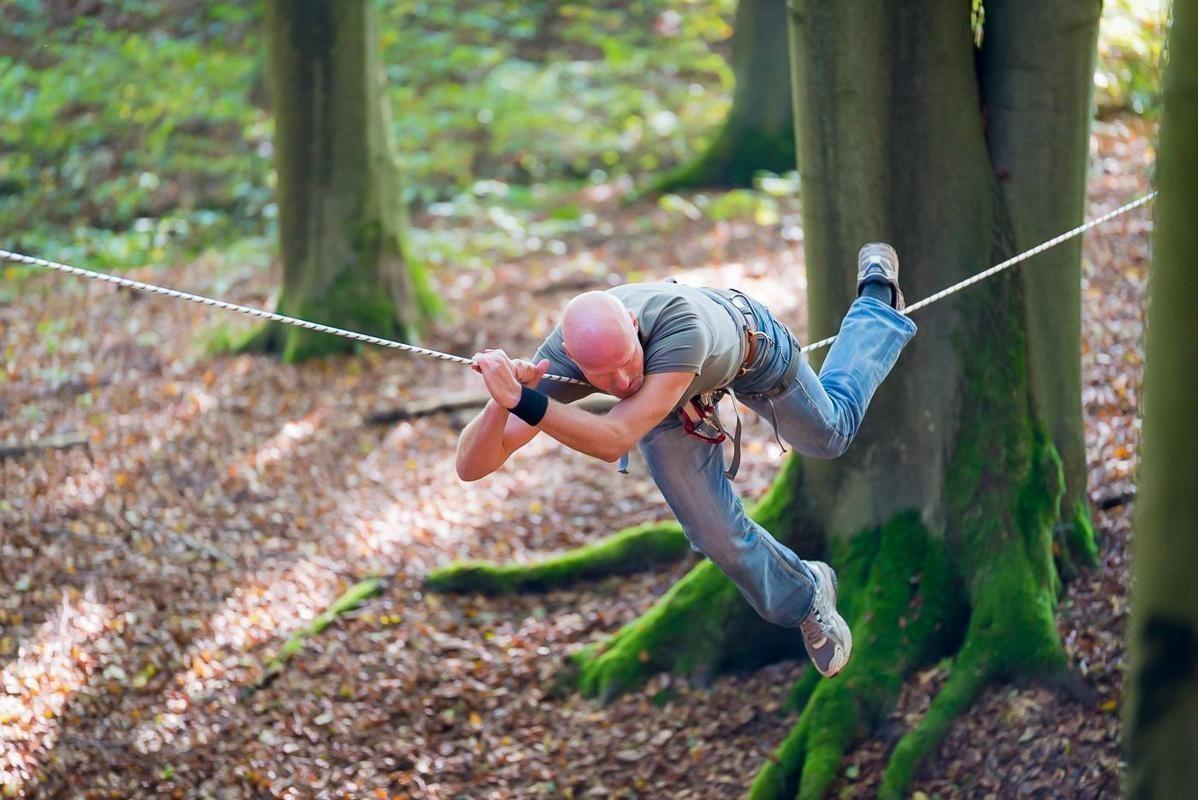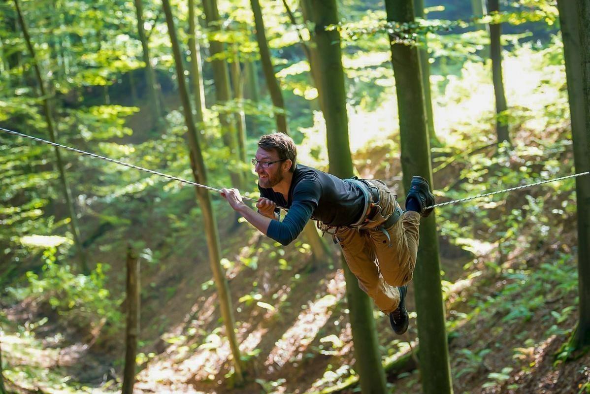 Ein Teilnehmer zieht sich an einem Seil zwischen Bäumen entlang