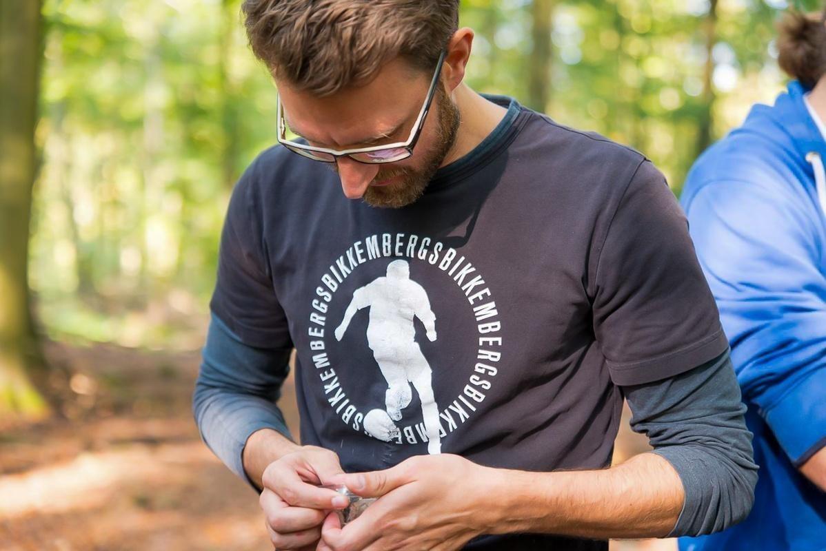 Mann befestigt Ausrüstung an seinem T-Shirt im Wald