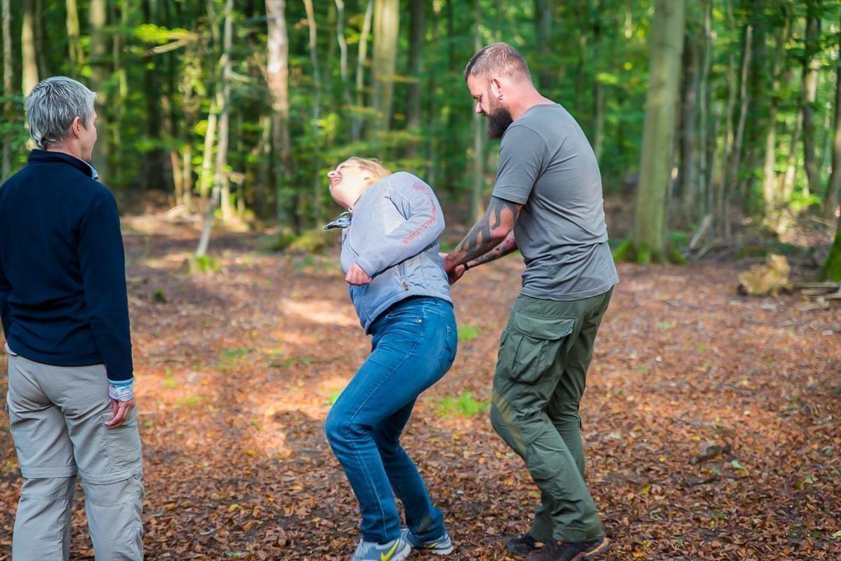 Zwei Personen üben eine Handgelenkstechnik im Wald, während andere zuschauen