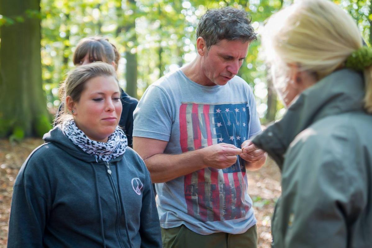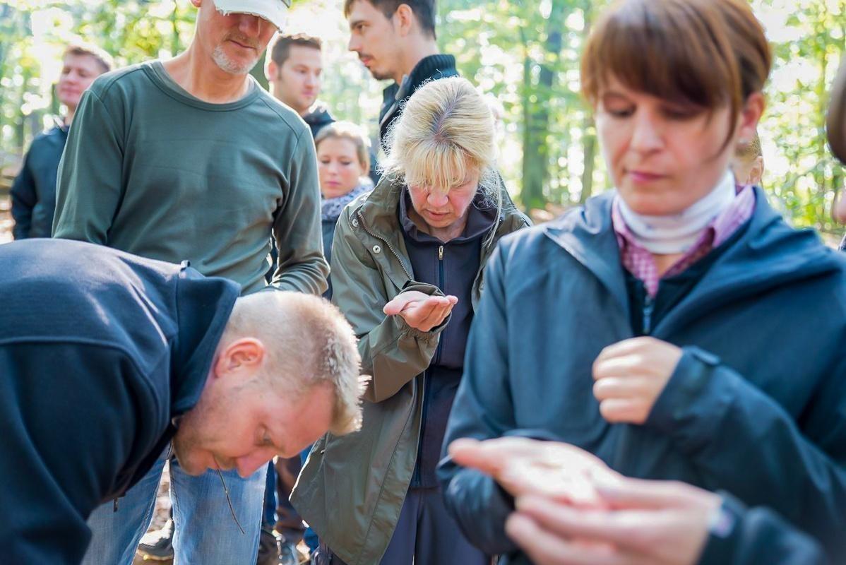 Gruppe übt praktische Fähigkeiten im Wald, einige Personen schauen auf ihre Hände