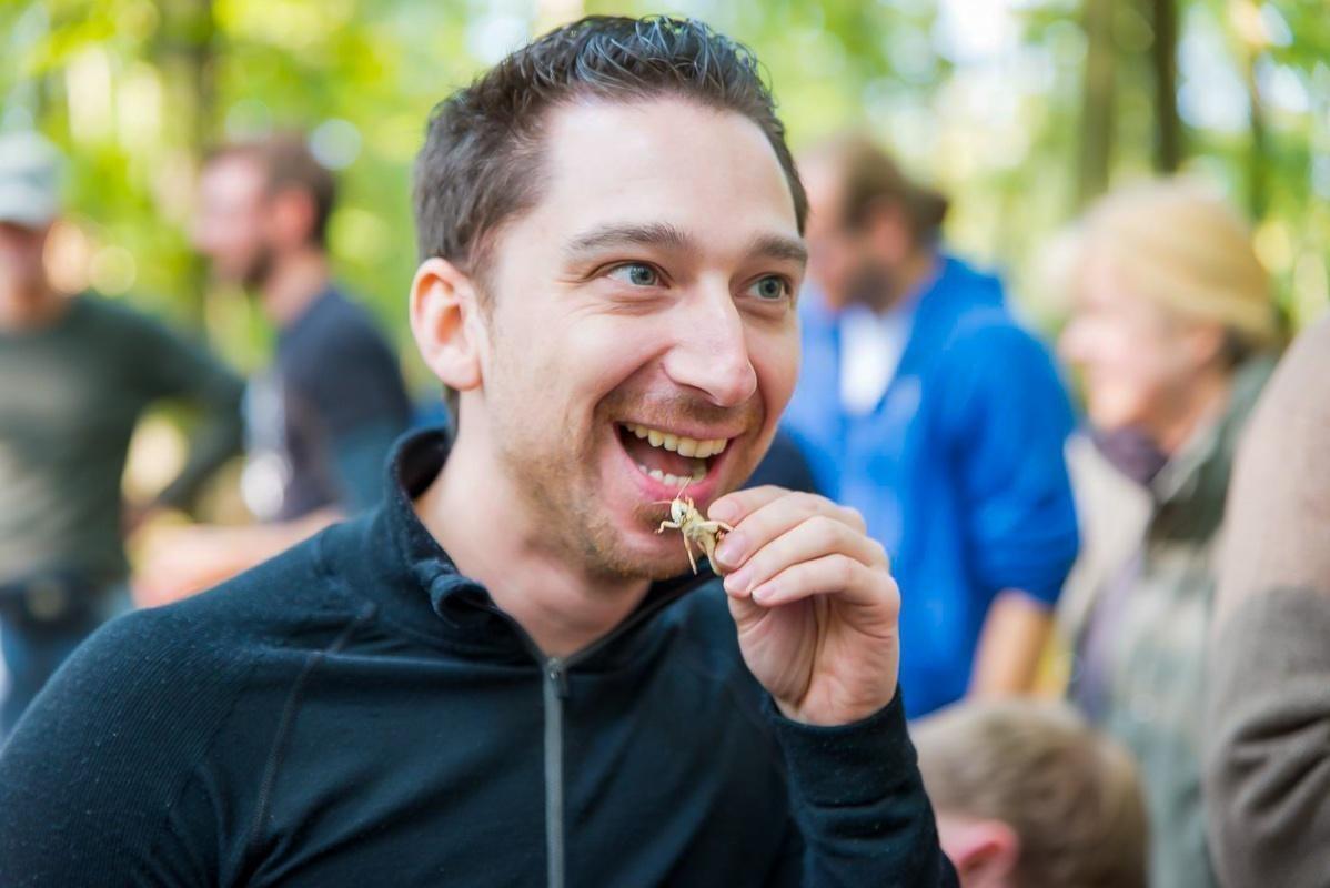 Mann hält eine Insektenart vor den Mund und lächelt