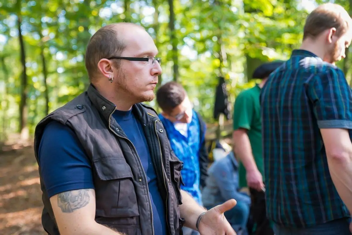 Mann erklärt Techniken mit einem Stock in einem Wald, umgeben von Zuhörern