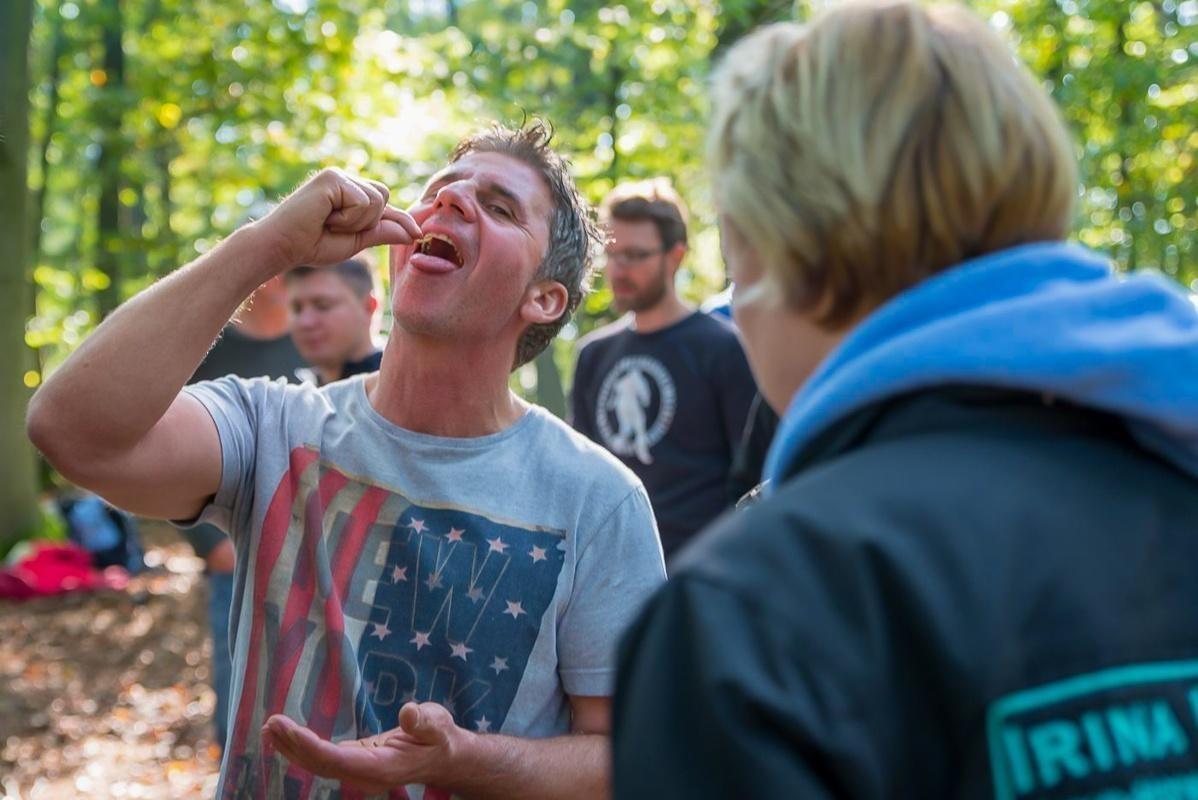Mann probiert essbare Pflanze im Wald, während andere Teilnehmer zuschauen