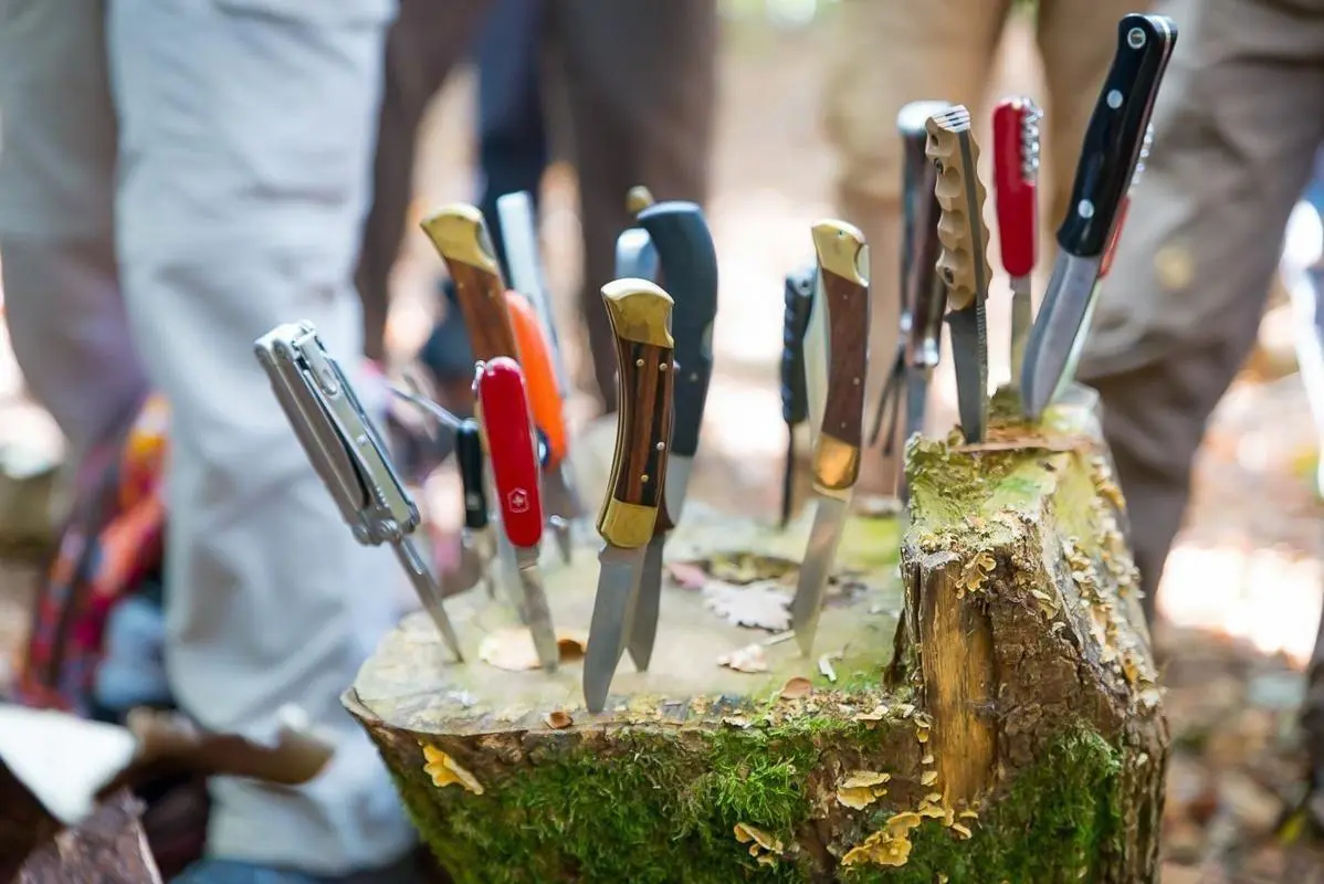 Ein Mann schnitzt mit einem Messer an einem Stock, während mehrere Personen zuschauen