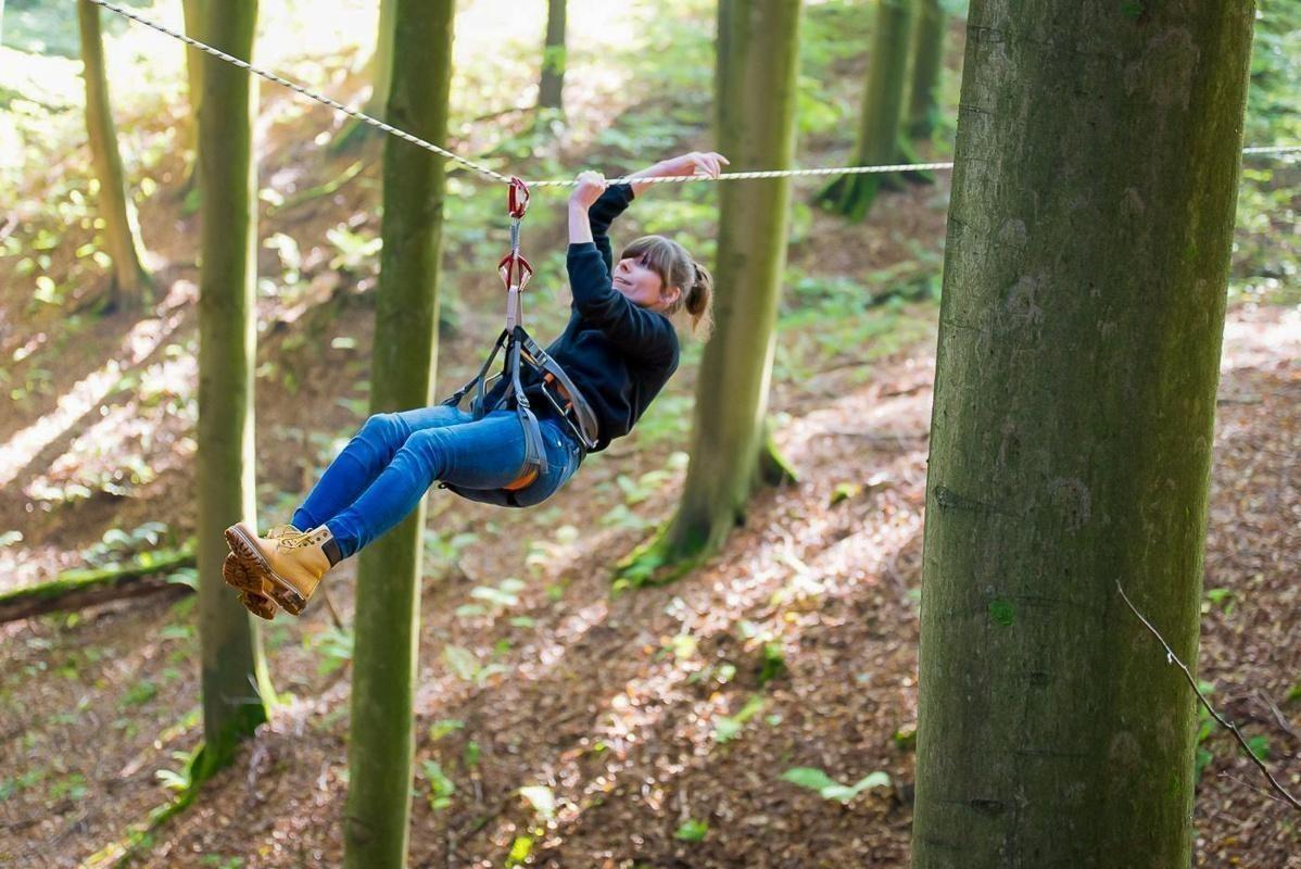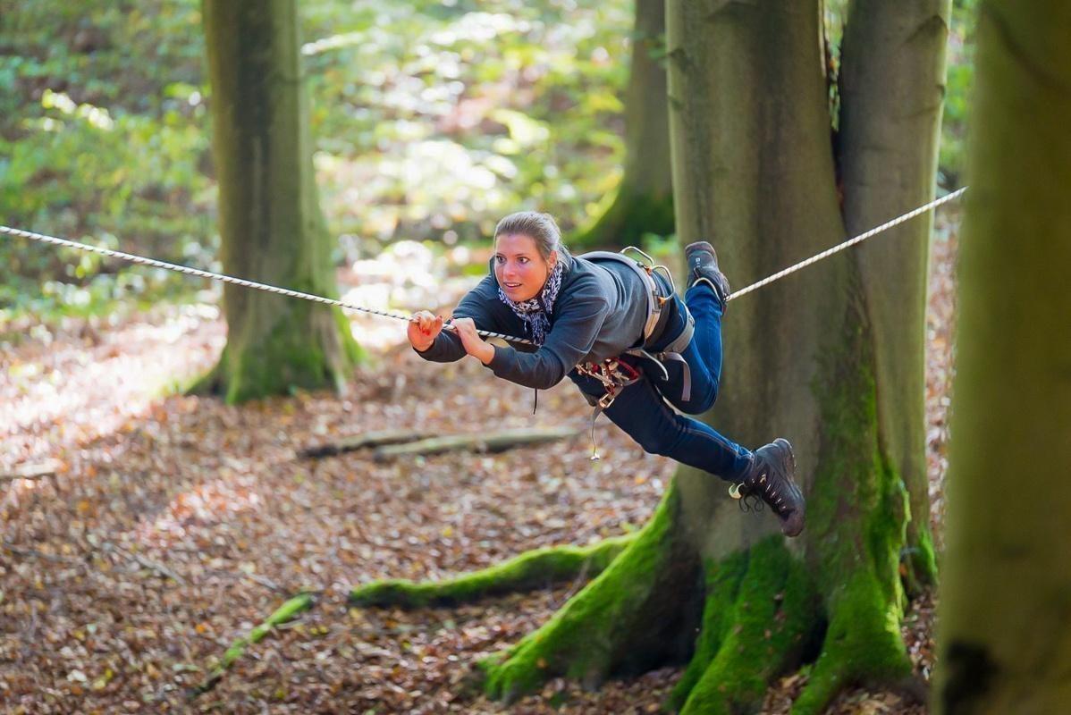 Seilbrücke verbindet zwei Bäume, während eine Person schwingt
