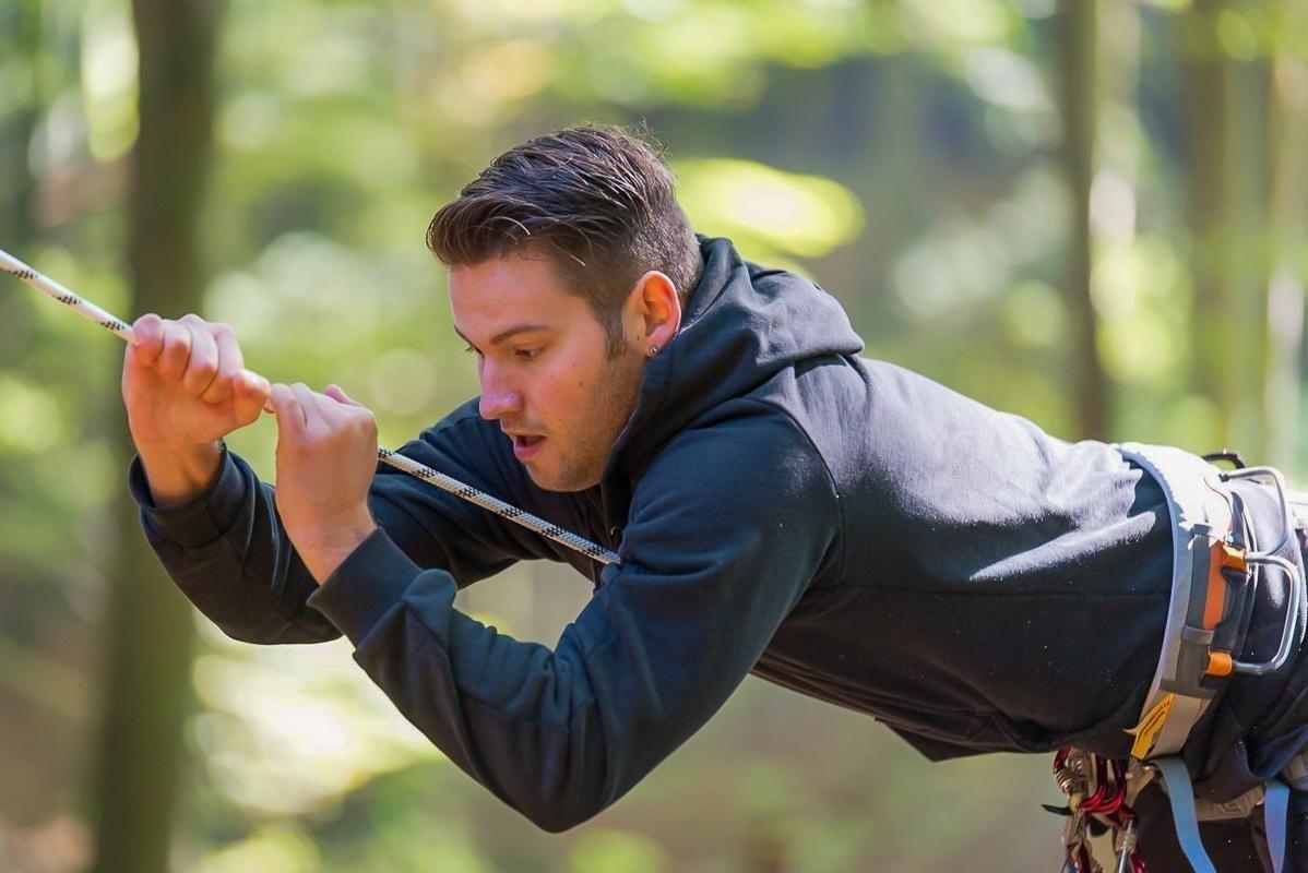 Mann zieht sich an einem Seil in den Wald hoch