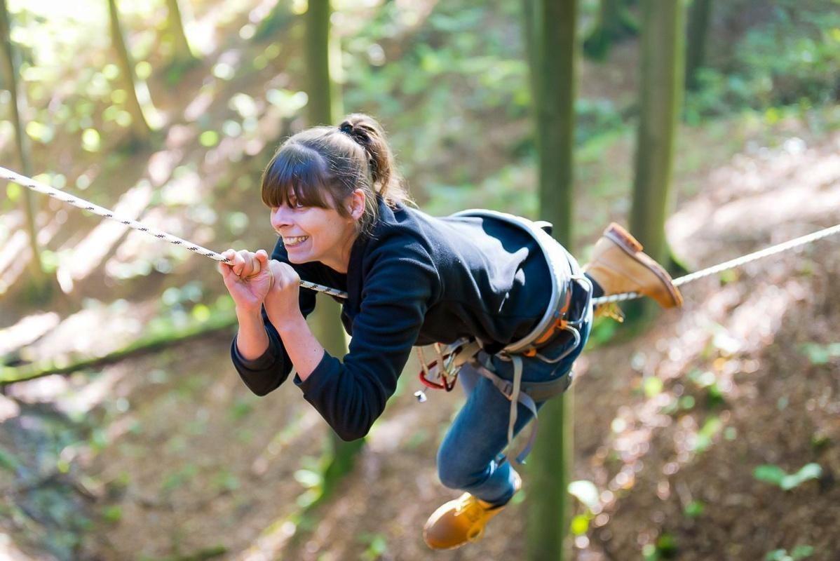 Seilbrücke verbindet zwei Bäume, während eine Person daran schwingt