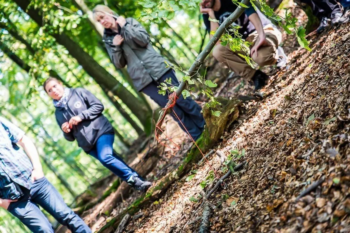 Gruppe von Personen steht im Wald und beobachtet eine Aktivität