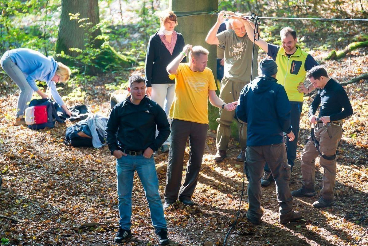 Ein Trainer befestigt eine Sicherungsgurt an einer Teilnehmerin im Wald
