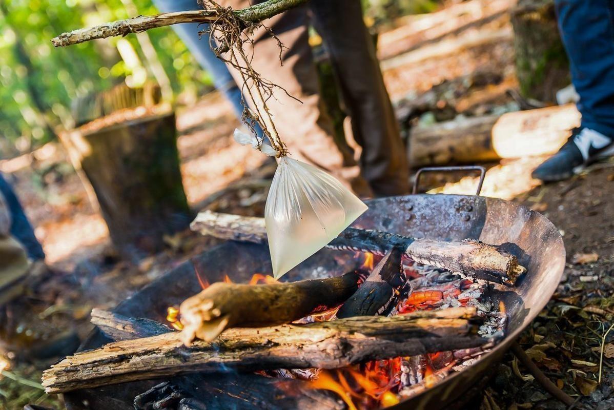 Wasserbeutel hängt über einem Feuer in einer improvisierten Kochstelle