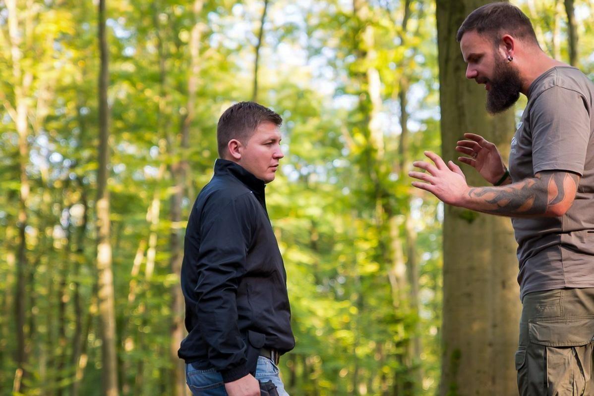 Zwei Personen diskutieren in einem Waldgebiet, umgeben von Bäumen