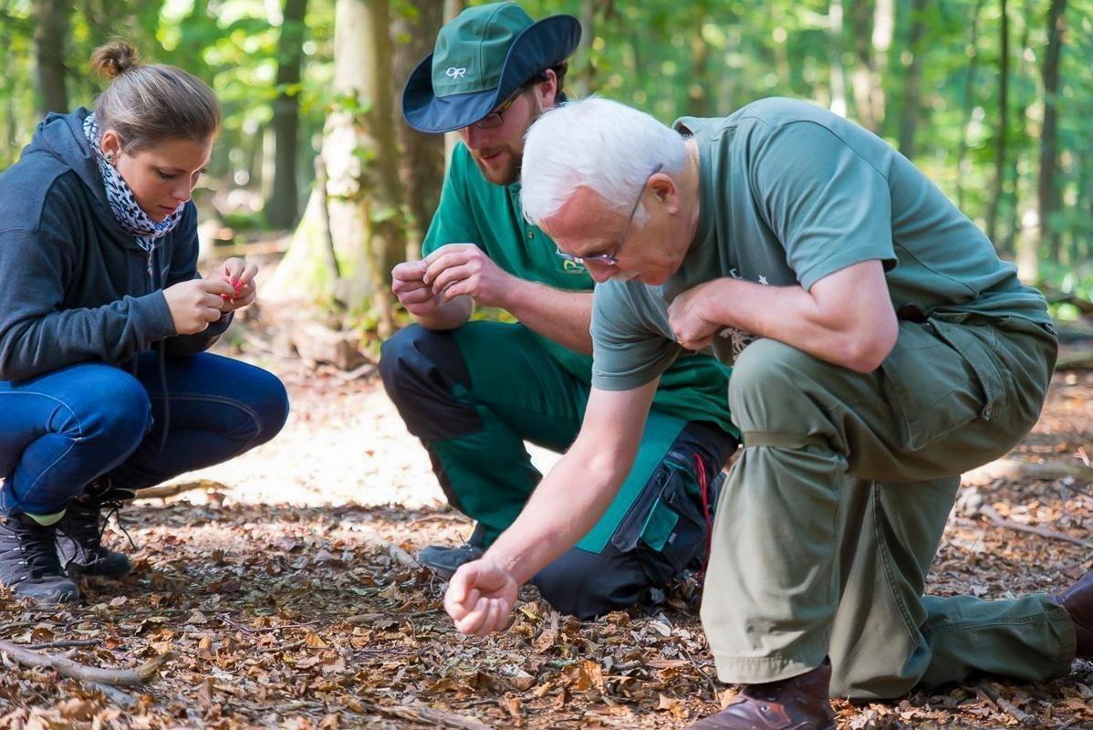 Zwei Personen untersuchen den Boden im Wald und zeigen auf etwas Kleines