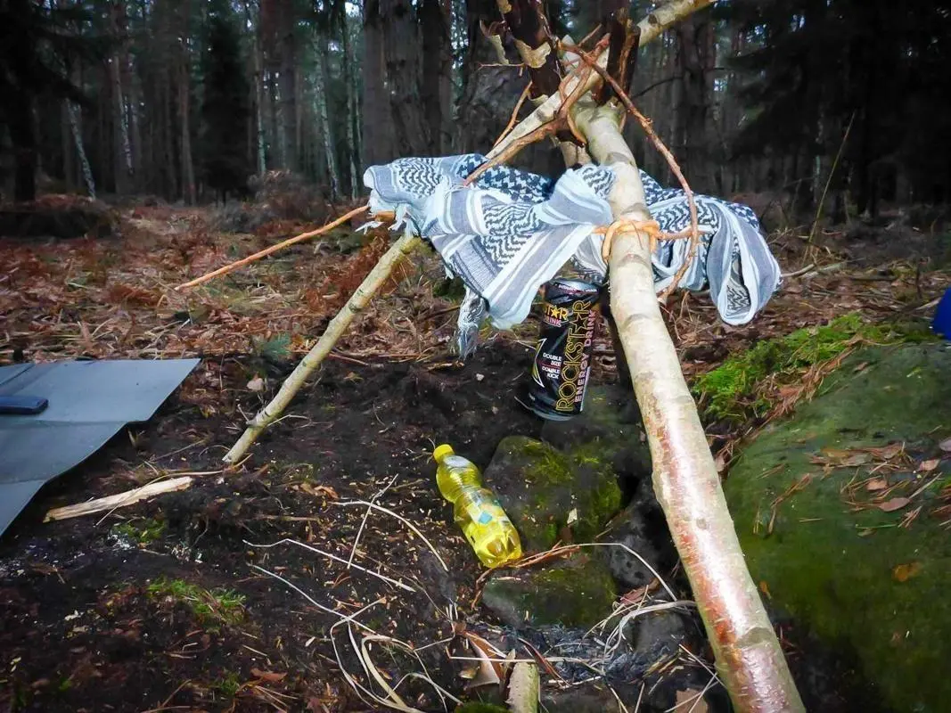 Für die Mahlzeit haben wir einen Grill aus Grünholz gebaut: zwei stabile Querhölzer als Auflage, darüber ein improvisierter Rost. Die Fische lagen flach über der Glut und konnten gleichmäßig garen, ohne dass Metall nötig war. Parallel hielten wir das Lager klein und windgeschützt, bereiteten Holz vor und achteten fortlaufend auf saubere Glutpflege.