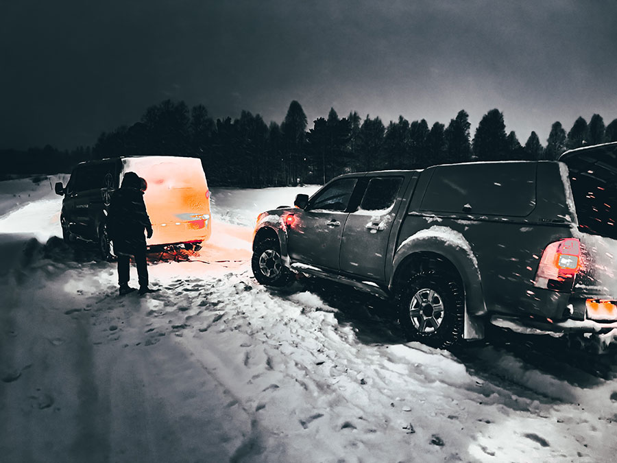 Die Erkenntnis? Sie überkam mich rasch. Ich war auf einem der entlegensten Abschnitte einer Straße in Süd Finnland gefangen, etwa 40 km von der Grenze zu Schweden entfernt. In den letzten Stunden hatte ich kein anderes Fahrzeug oder irgendeine Behausung erblickt, und mit der bevorstehenden Schließung der Grenzewegen dem Schneesturm gab es keinen Grund für irgendjemanden, diesen Weg in den nächsten Tagen zu befahren. Diese Straße war mir wohlbekannt, und mir war klar, dass die nächstmögliche Hilfe an der Grenzstation zu erwarten war. Ebenso war mir bewusst, dass der Schneeräumungsdienst vermutlich der Nächste auf der Straße sein würde – allerdings nicht in den nächsten 48 Stunden. Im Sommer hätte ich diese Strecke vielleicht noch zu Fuß zurücklegen können, aber bei minus 33 Grad, in der Dunkelheit und mit diesem Schneesturm war dies eine ganz andere Herausforderung. Berechnet man die gefühlte Temperatur unter diesen Bedingungen, ergibt sich ein lebensgefährlicher Wert.