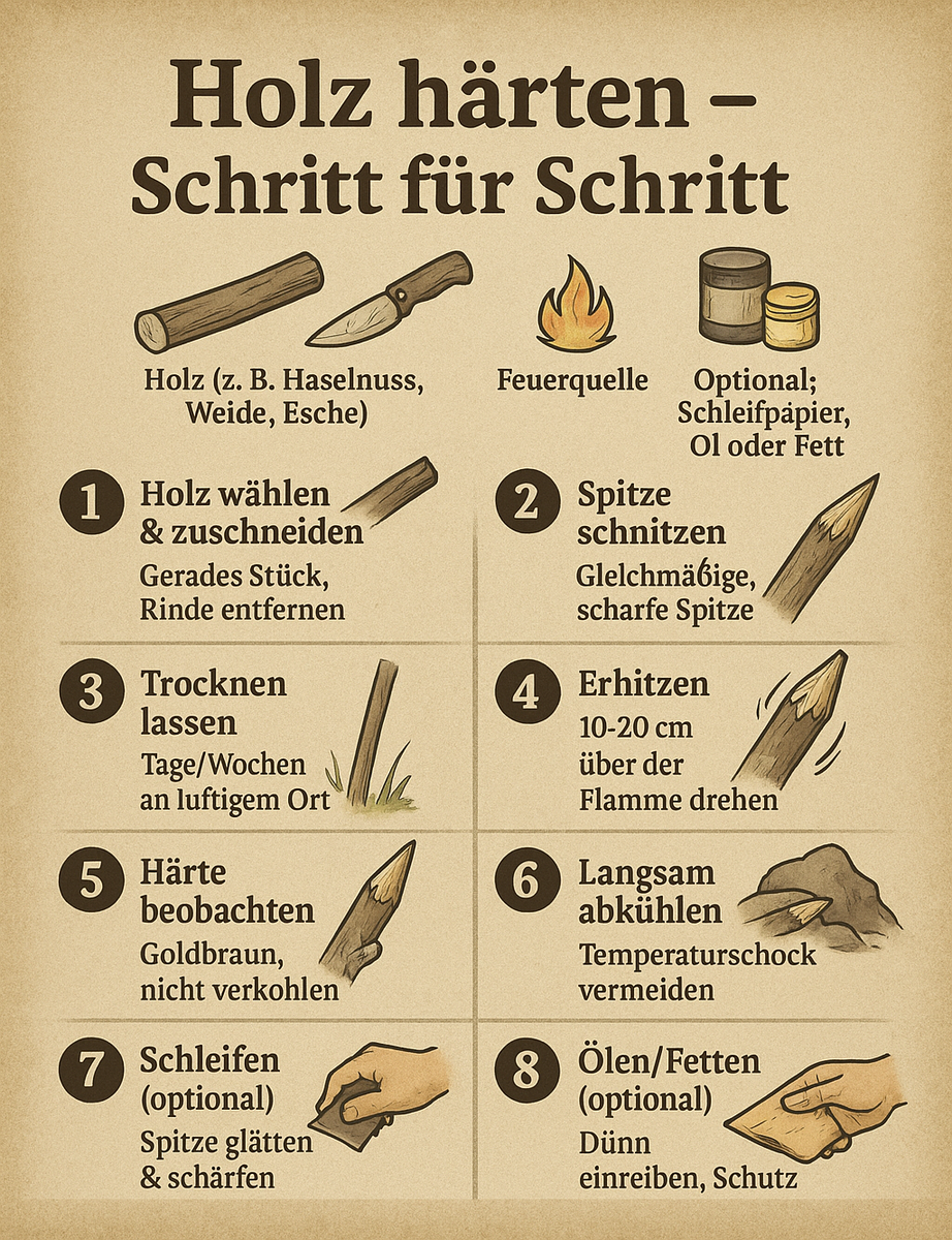 Durch das Härten von Holz kannst du langlebige und effektive Werkzeuge und Waffen herstellen, die für verschiedene Outdoor-Aktivitäten und Survival-Situationen geeignet sind. Die Technik erfordert wenig Ausrüstung und Materialien, sodass sie sich gut für Bushcraft, Camping oder das Erlernen traditioneller Handwerkskünste eignet.